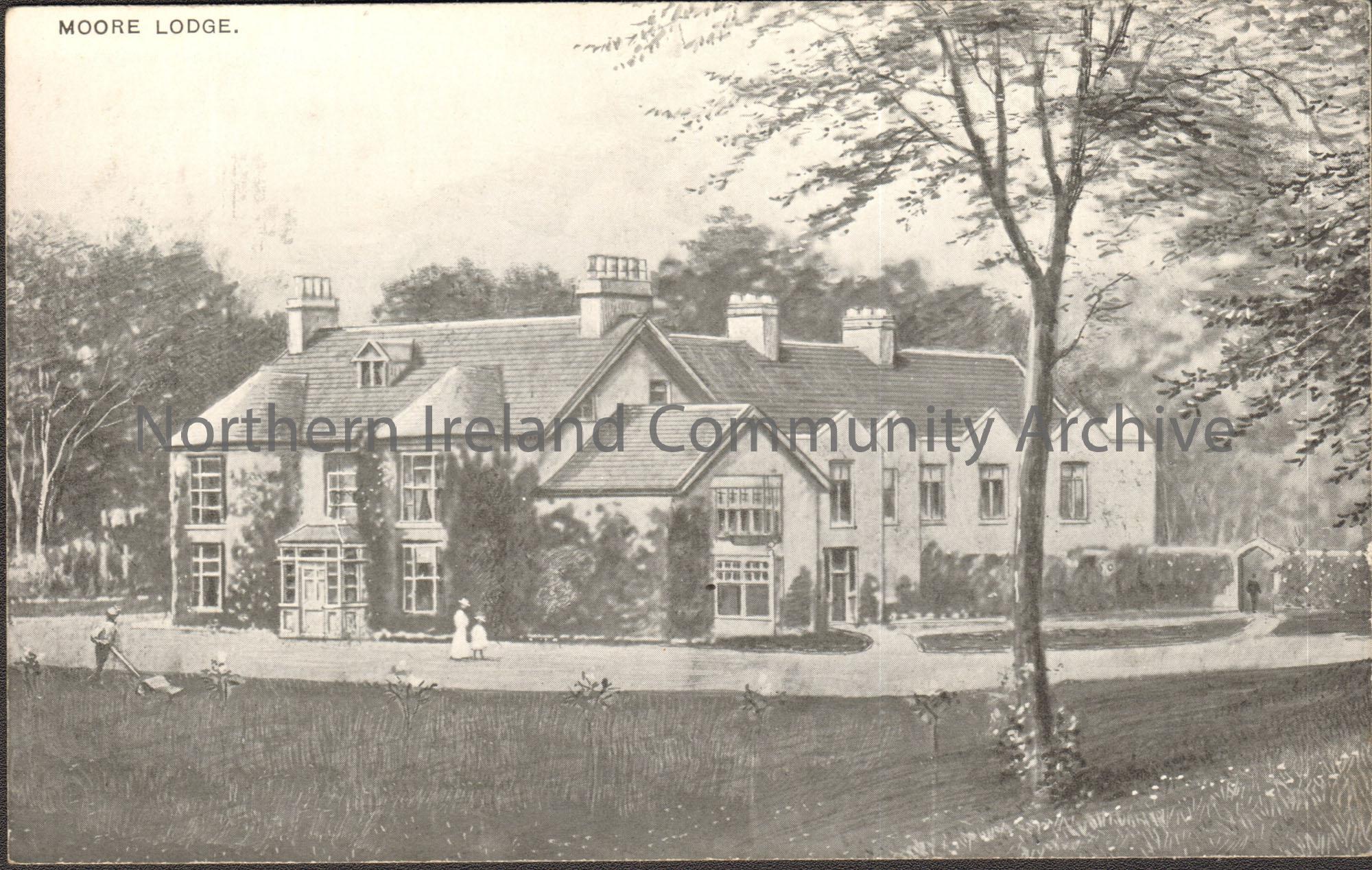 Black and white painting of Moor Lodge and gardens. Tree in foreground.
