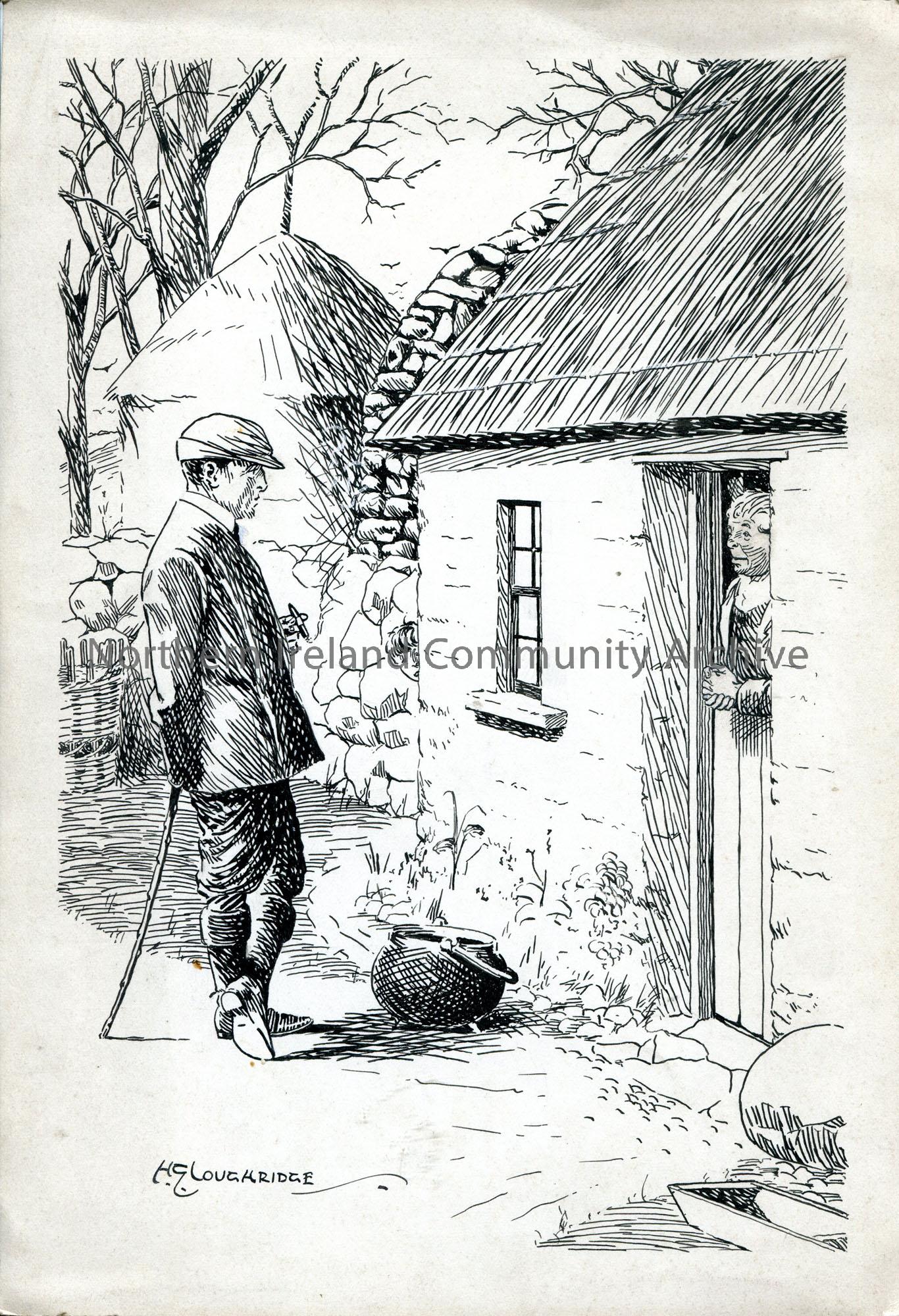 Black and white pen drawing a man standing outside a thatched cottage talking to the resident who is in the doorway. Signed by H. G. Loughridge. Captioned on reverse it reads, 'Stranger 'war the new candidate much put out when they threw the stale eggs at him? Native - [?] was son. He was awful decomposed!'