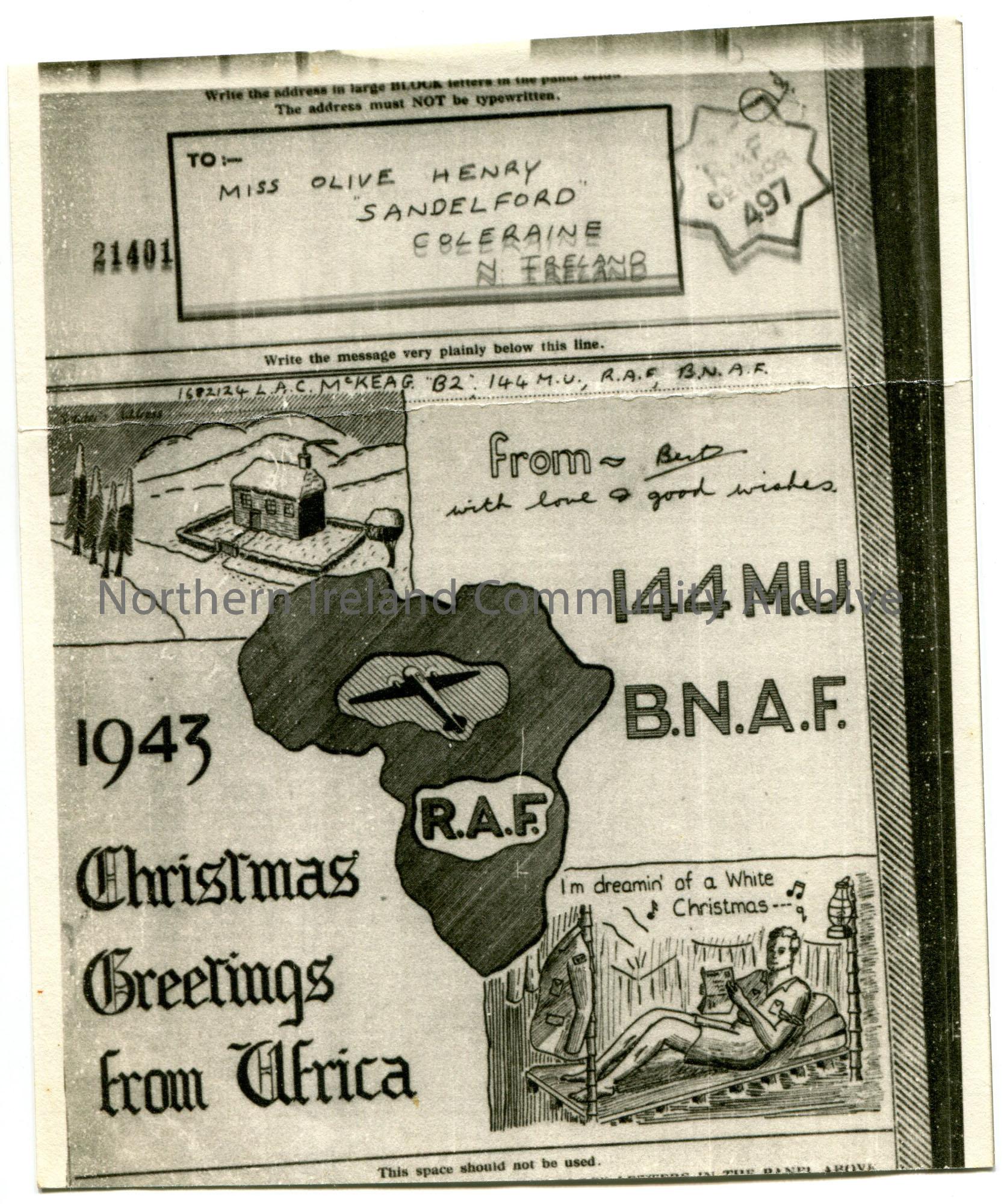 Black and white photocopy of a Christmas Greetings message to Olive Henry. Reads, ‘Christmas Greetings from Africa 1943’. Passed by RAF Censor stamp t…