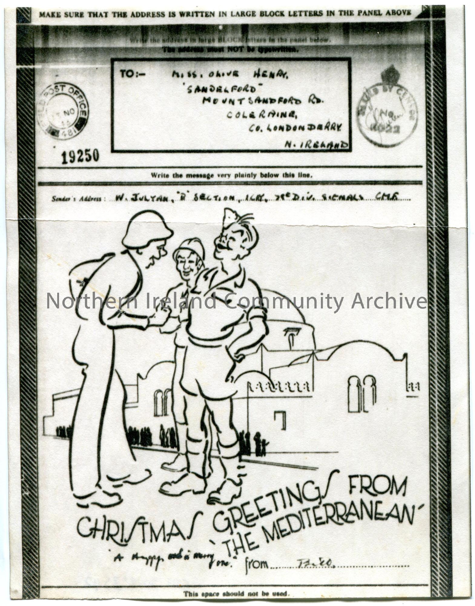 Black and white photocopy of a Christmas Greetings message to Olive Henry. Reads, ‘Christmas Greetings from the Mediterranean’. Passed by Censor stamp…