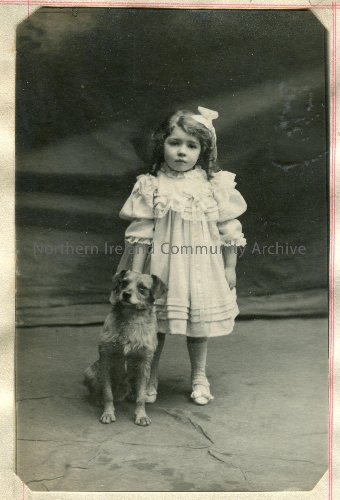Black and white photograph captioned, ‘Emily Henry’. Shows a little girl standing beside a dog which is sitting.