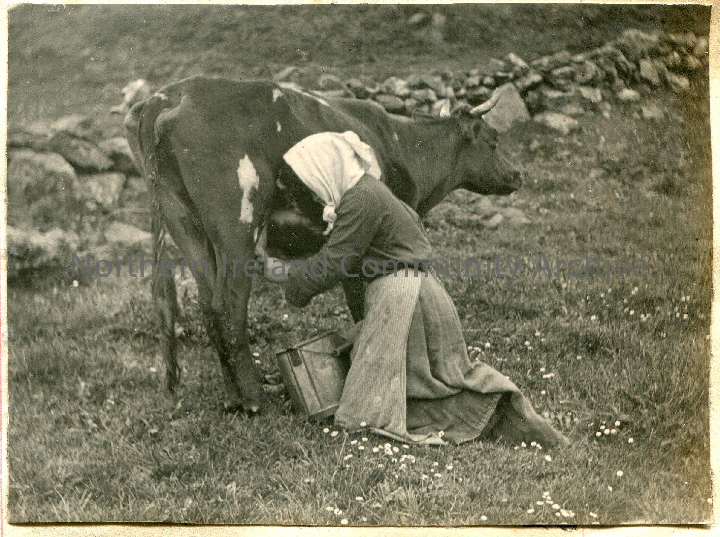 Black and white photograph captioned, ‘On Rathlin Is [Island]’. Image of a woman milking a cow.
