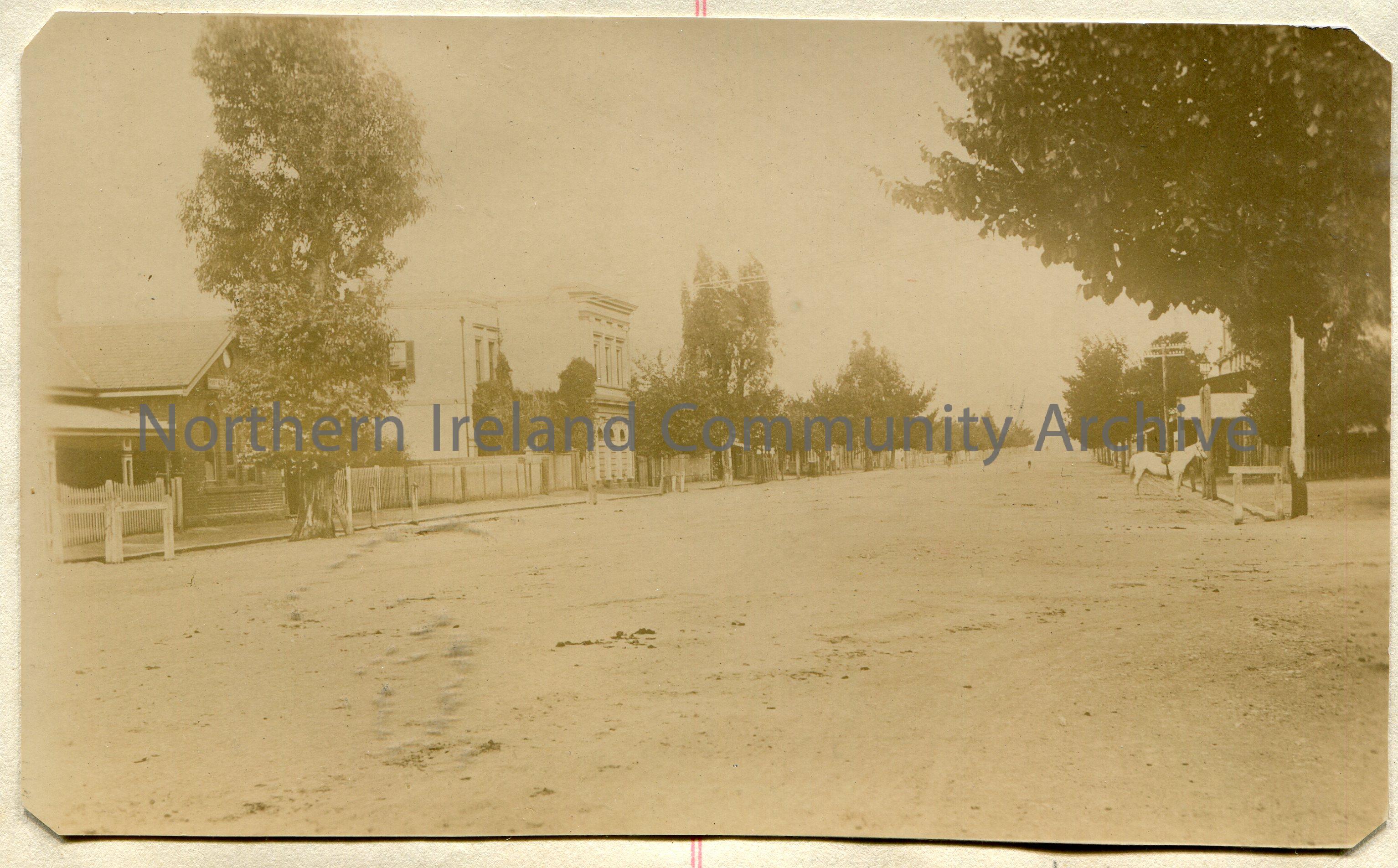 Black and white photograph captioned, 'Whyte St. Coleraine. Vic. [Victoria]'. Image of a deserted street scene. A horse can be seen to the right of the image.