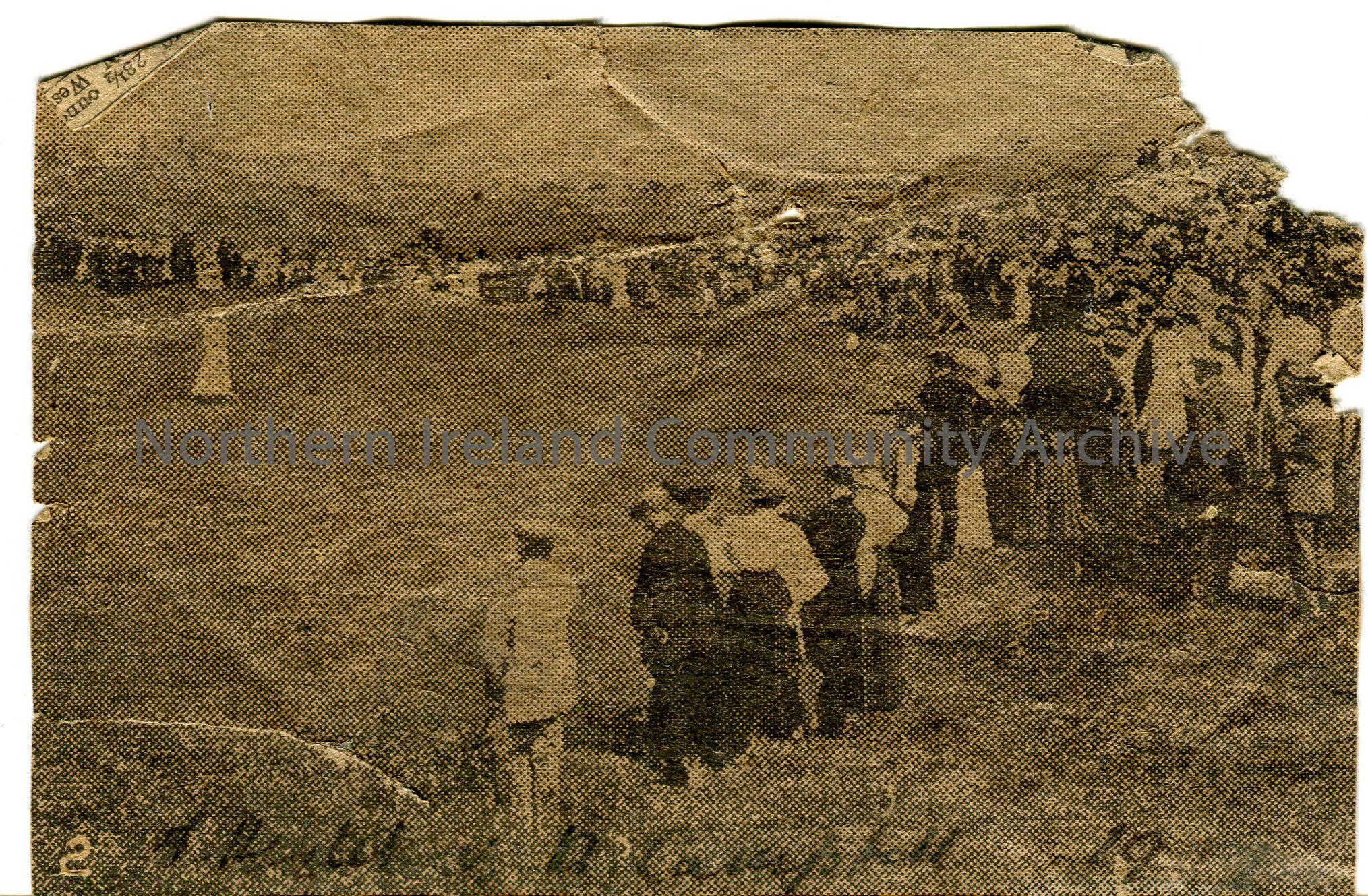 Black and White photograph cut from newspaper. Shows golfing scene, with one lady player visible. Handwritten along bottom of photograph - '? Hezlet D Campbell 1902' [Dorothy Campbell]