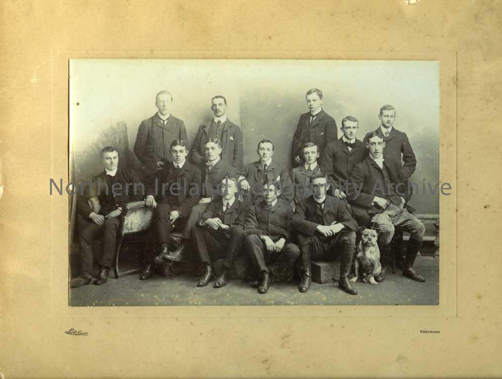 Black and white photograph in cream mount -‘Lee, Portrush’. Photograph is of 14 men and a dog. On back reads ‘Jack McCandless centre front, hardware a…
