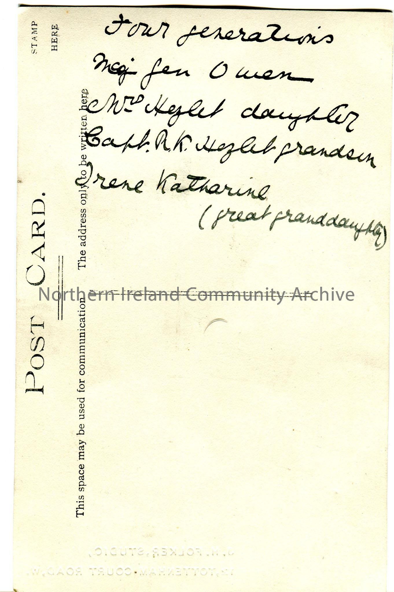 Black and White photograph of 4 generations of Hezlet family - R K Hezlet, his baby daughter Irene, his mother and grandfather. Details on reverse