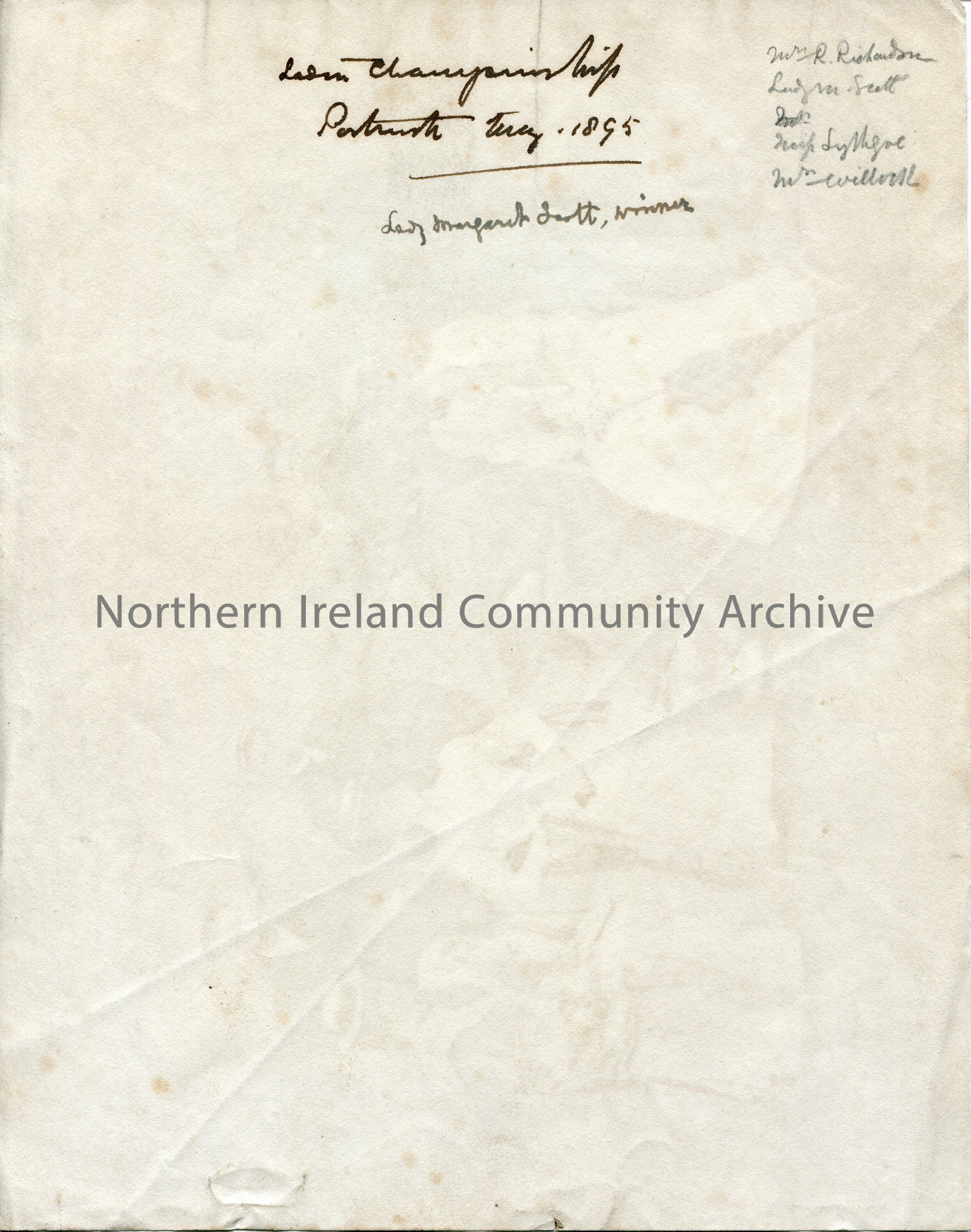 Black and white photograph of 4 women golfers sitting on chairs on a golf course in all their finery in front of their caddies who are in white collars, waistcoats and 'dunchers' [ flat caps]. Silver cup in the foreground. 'THE GOLF MEDALISTS AND CADDIES. PORTRUSH. /95 LEE. (L)' printed on front of image. 'Ladies Championship, Portrush, July, 1895. Lady Margaret Scott, winner. Wm R. Richardson, Lady M. Scott' handwritten on reverse. Two other names noted are illegible.