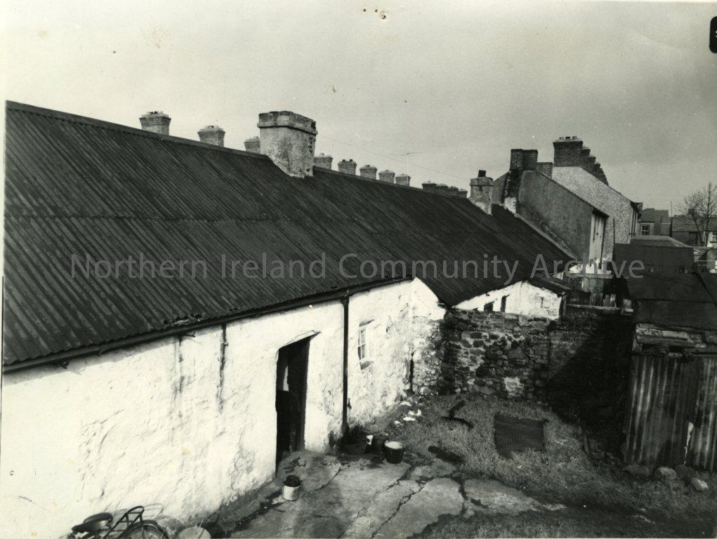 Black and white photograph of 76/77 Long Commons (looking down the street at the rear), Coleraine, 1957