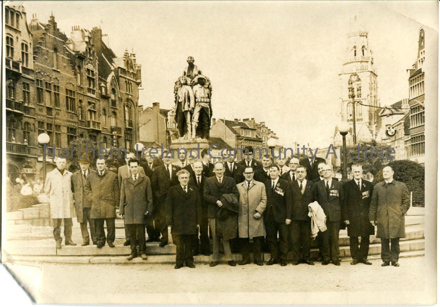 Black and white photograph of a group of men, some with medals standing in front of a statue consisting of a lady with two soldiers in front of her.
