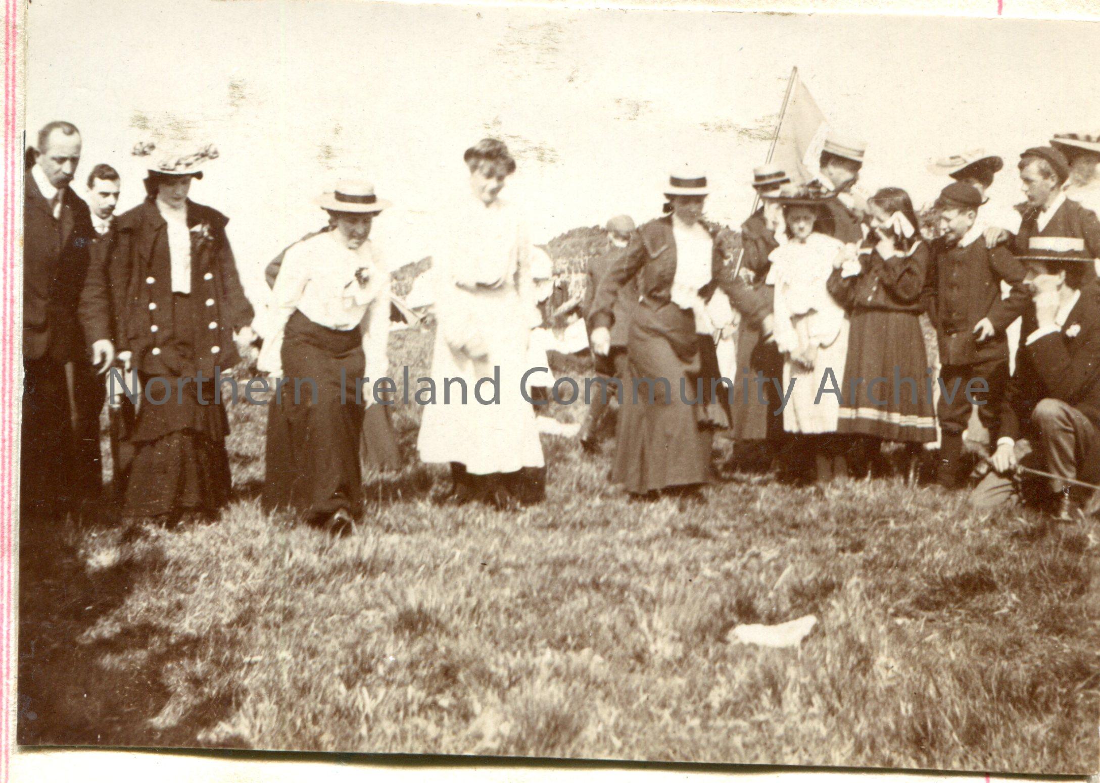 Black and white photograph of a group of men, women and children playing an outdoor game on grass. Possibly Edwardian period.