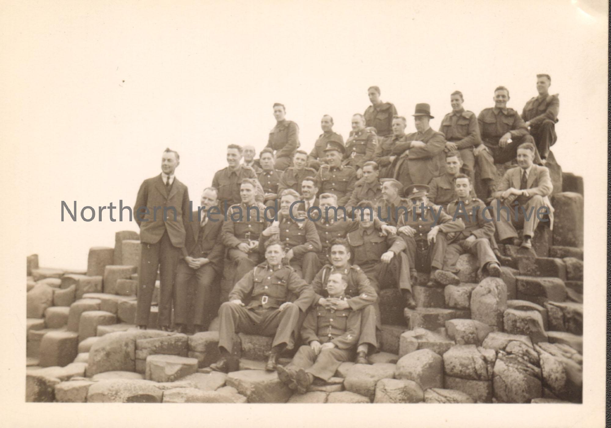 Black and white photograph of a group of soldiers at the Giant’s Causeway
