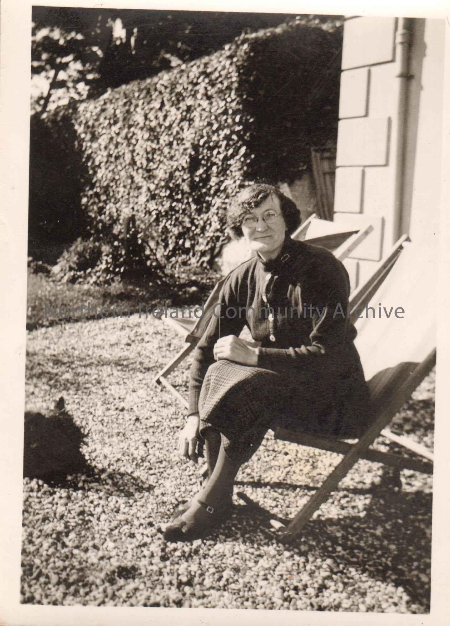 Black and white photograph of a lady sitting in a deck chair with a dog. Mary Shiels.