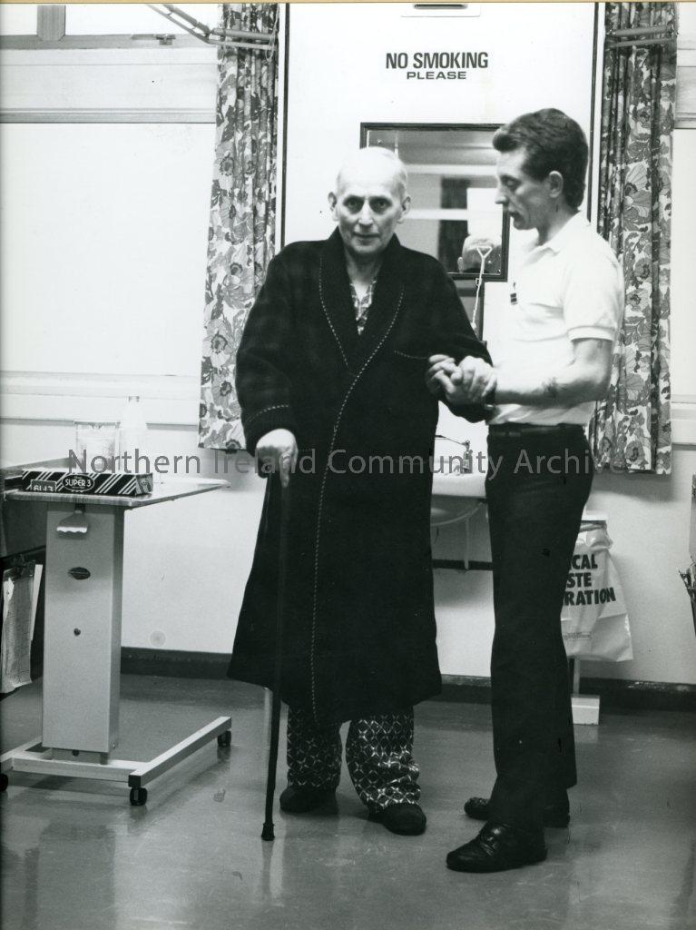 black and white photograph of a man aiding an elderly man with a walking stick in a hospital (3306)