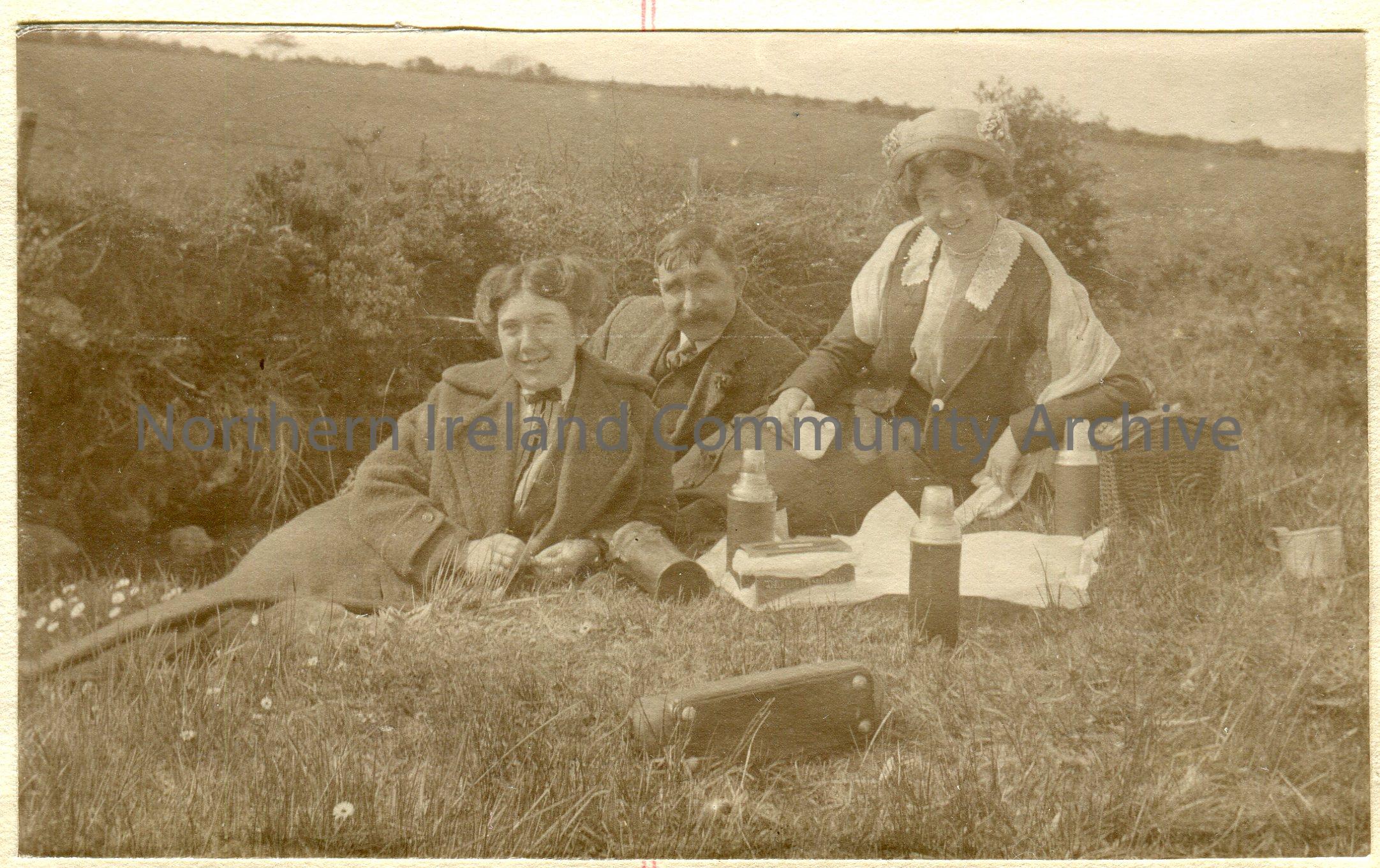 Black and white photograph of a man and two women having a picnic. Sam Henry’s wife, Maimie, is pictured on the far right.
