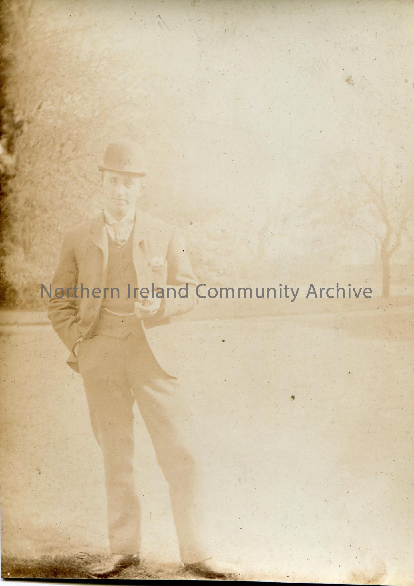 Black and white photograph of a man in a park wearing a suit and bowler hat.