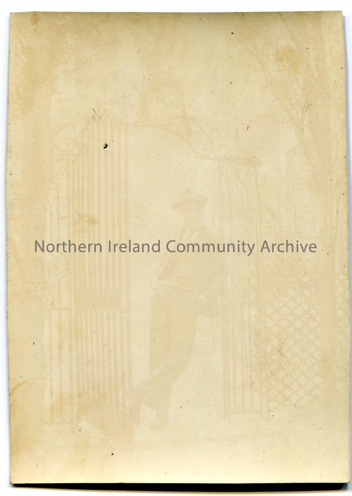Black and white photograph of a man leaning against a metal gate. Image very faded.