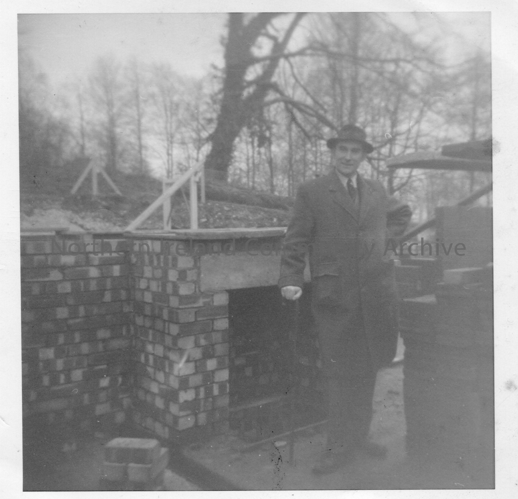 Black and white photograph of a man wearing a coat and hat with his hand on an umbrella. He is standing in front of a bricked wall with woodland in the background.