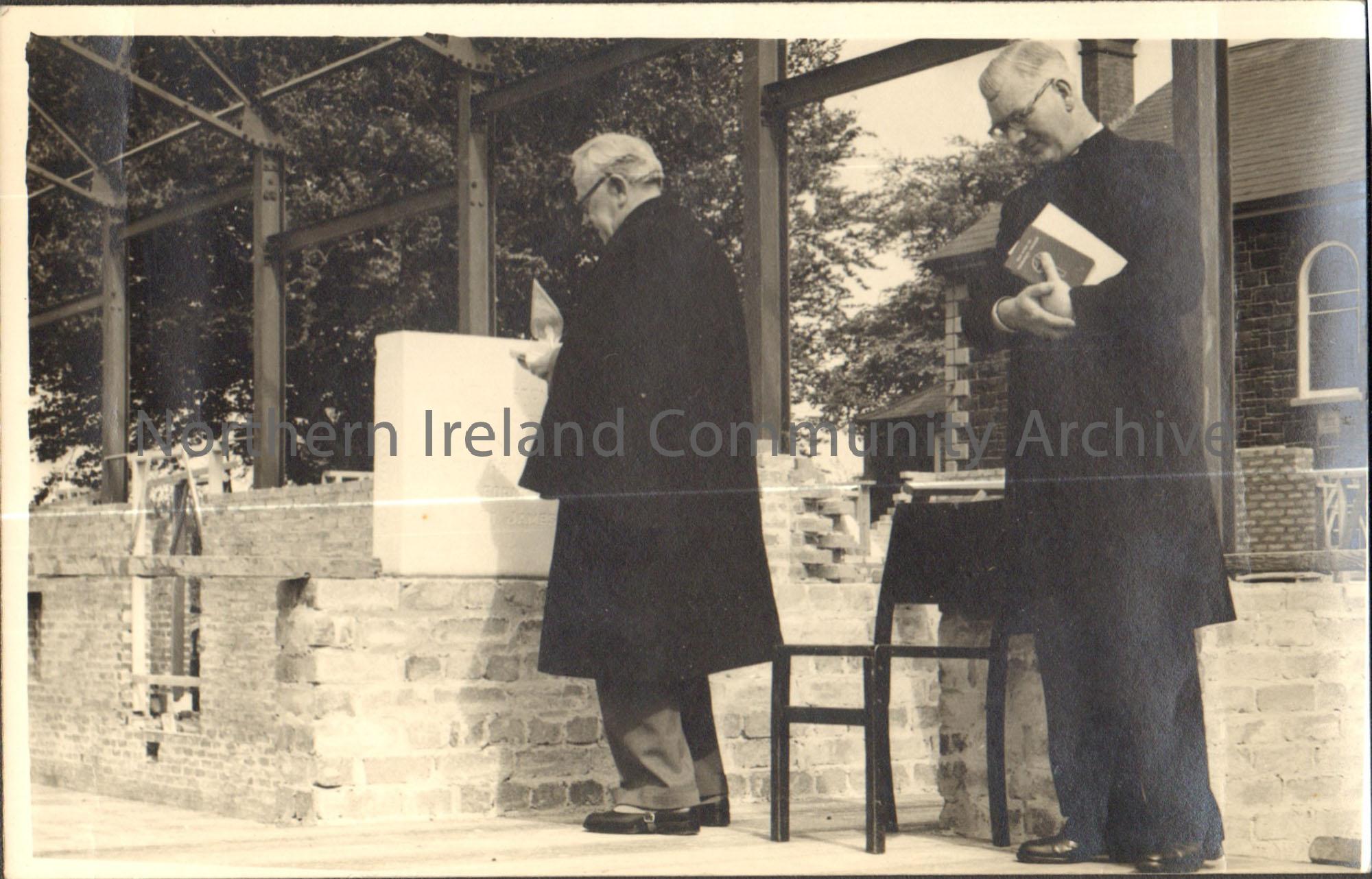 Black and white photograph of a minister laying the foundation stone for St James’ Church Hall with another minister standing behind him holding a boo…