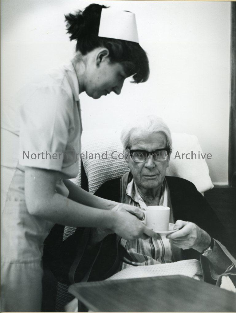 black and white photograph of a nurse giving an elderly man a cup of tea/coffee