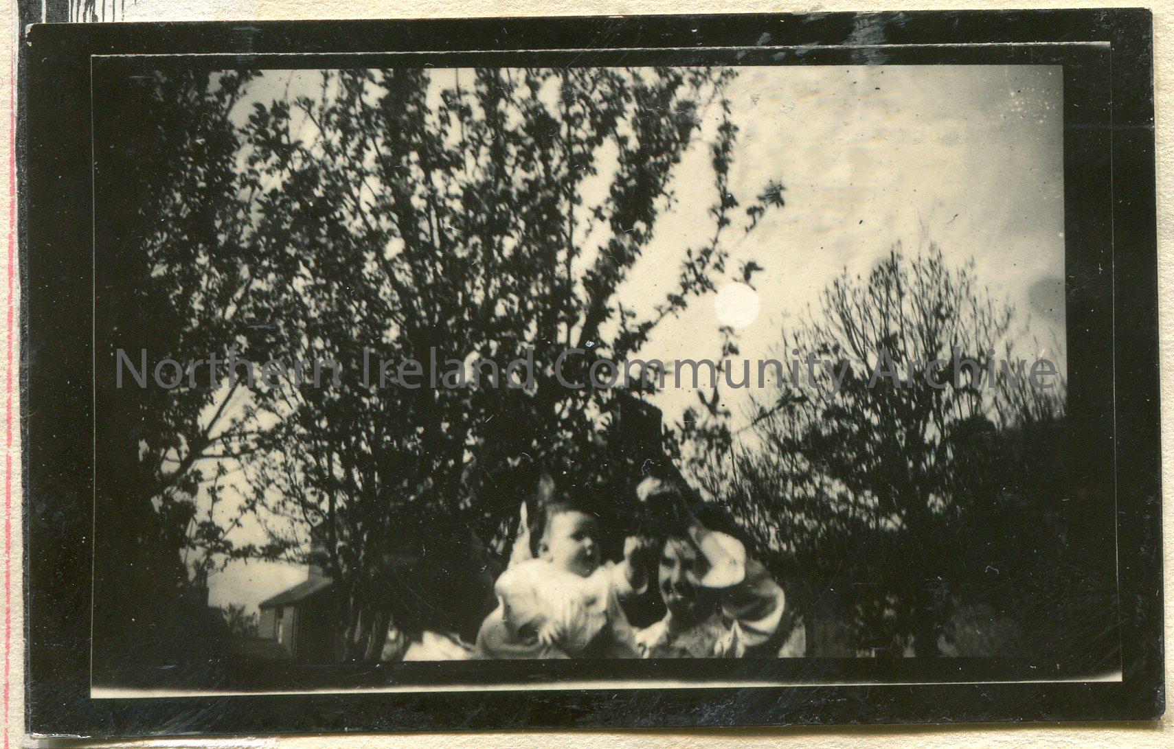 Black and white photograph of a woman and Sam Henry's daughter, Olive with trees behind them.