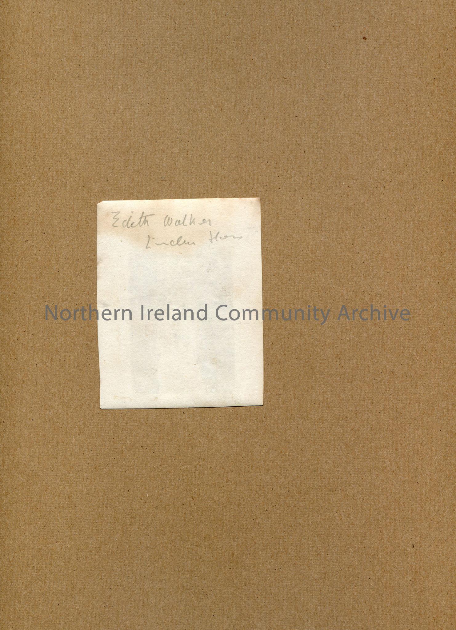 Black and white photograph of a woman sitting on a chair in a garden. Edith Walker, Linden? House is handwritten on back of photograph.