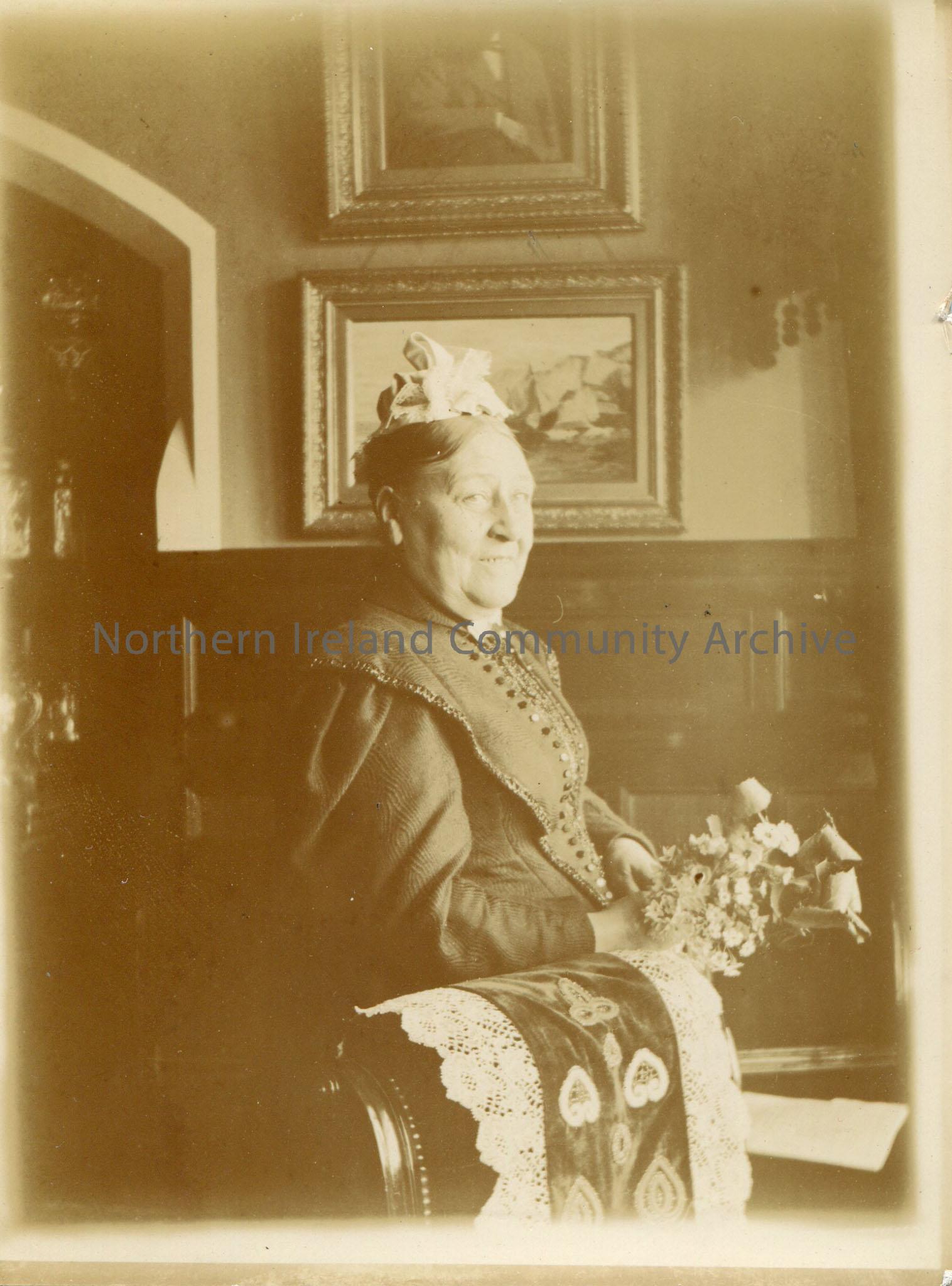 Black and white photograph of a woman standing behind a chair holding a posey of flowers.