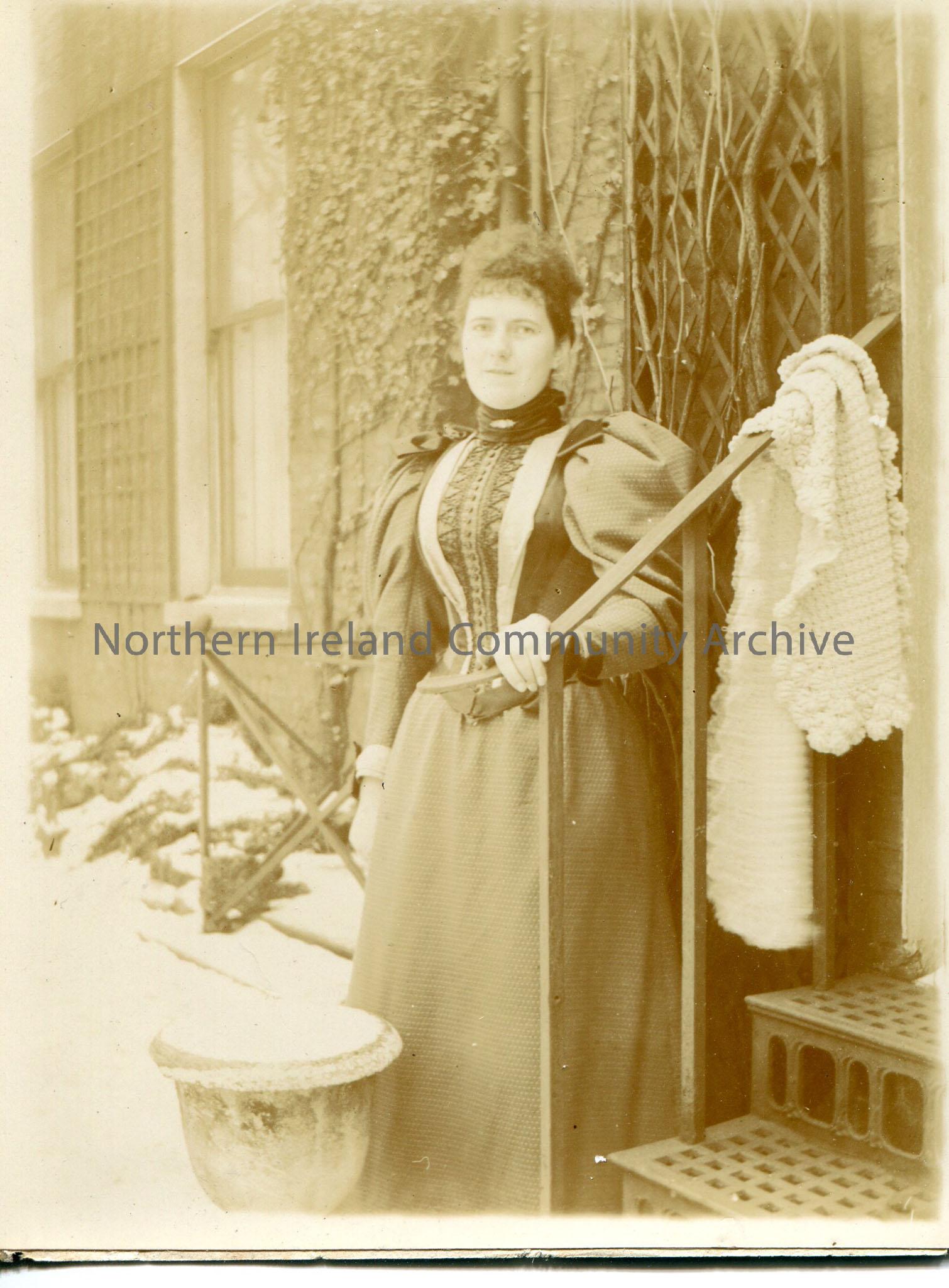 Black and white photograph of a woman standing with one hand on a railing which has a blanket on it. There is snow on the ground.