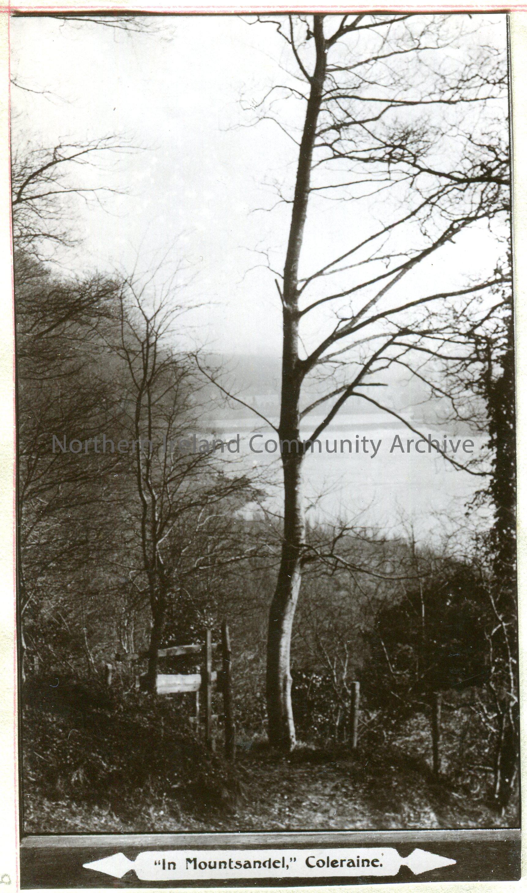 Black and white photograph of a wooded area looking out towards a river. Titled, 'In Mountsandel, Coleraine'.