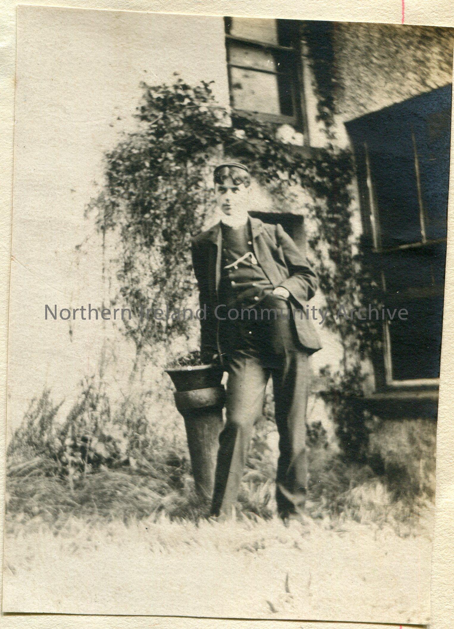 Black and white photograph of a young man standing in front of a house with one hand in his pocket.
