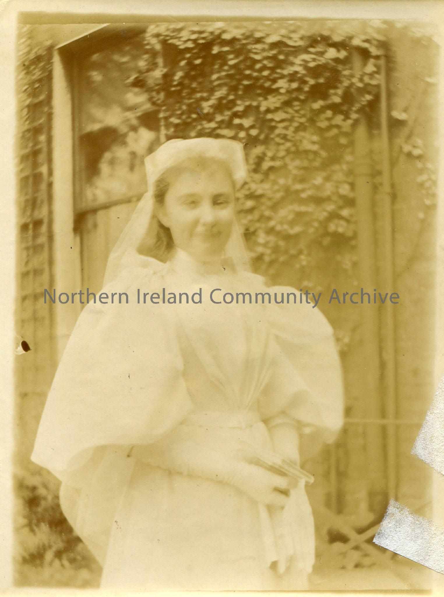 Black and white photograph of a young woman in a white dress and veil holding a book.