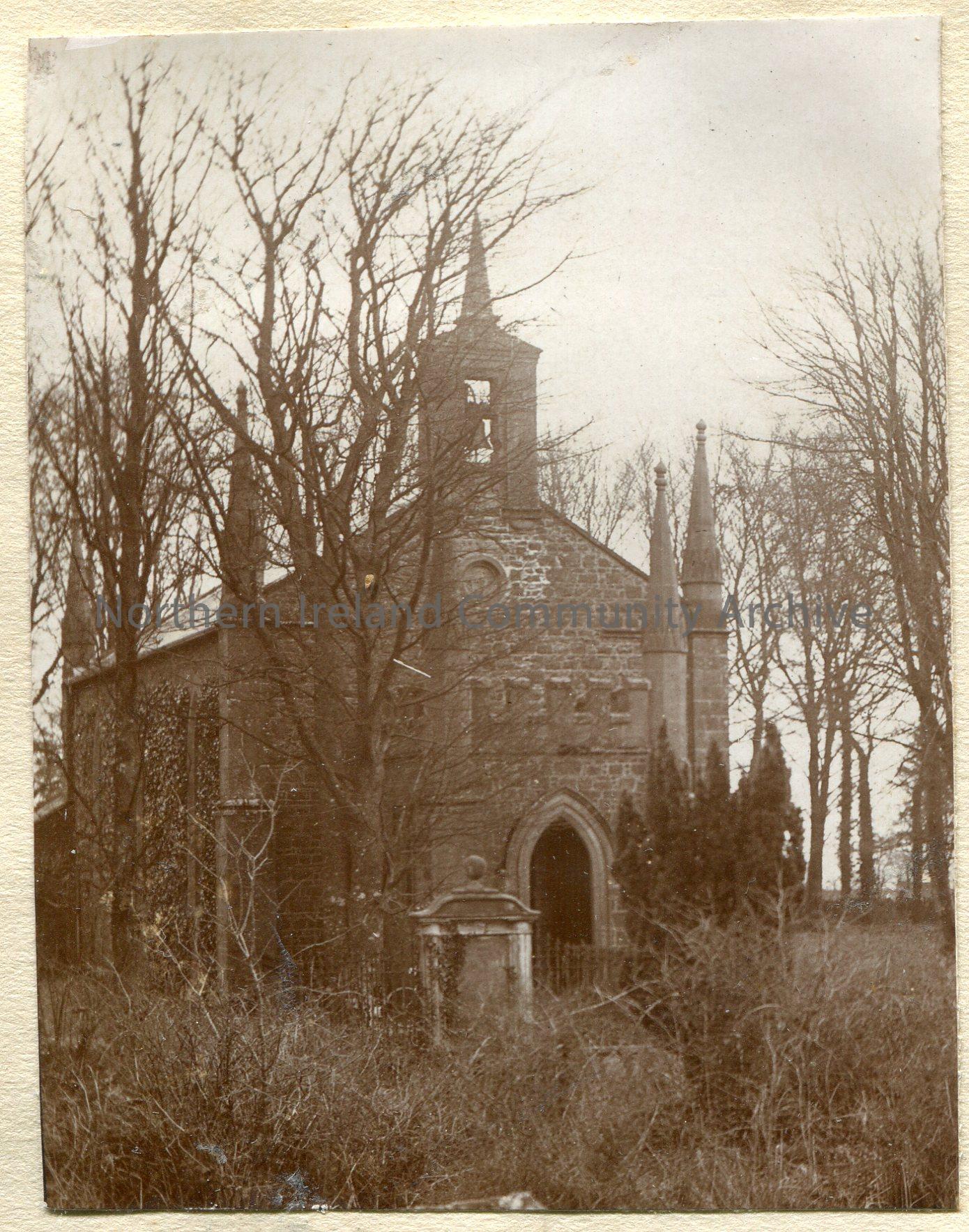 Black and white photograph of Ardtrea Parish church among trees.