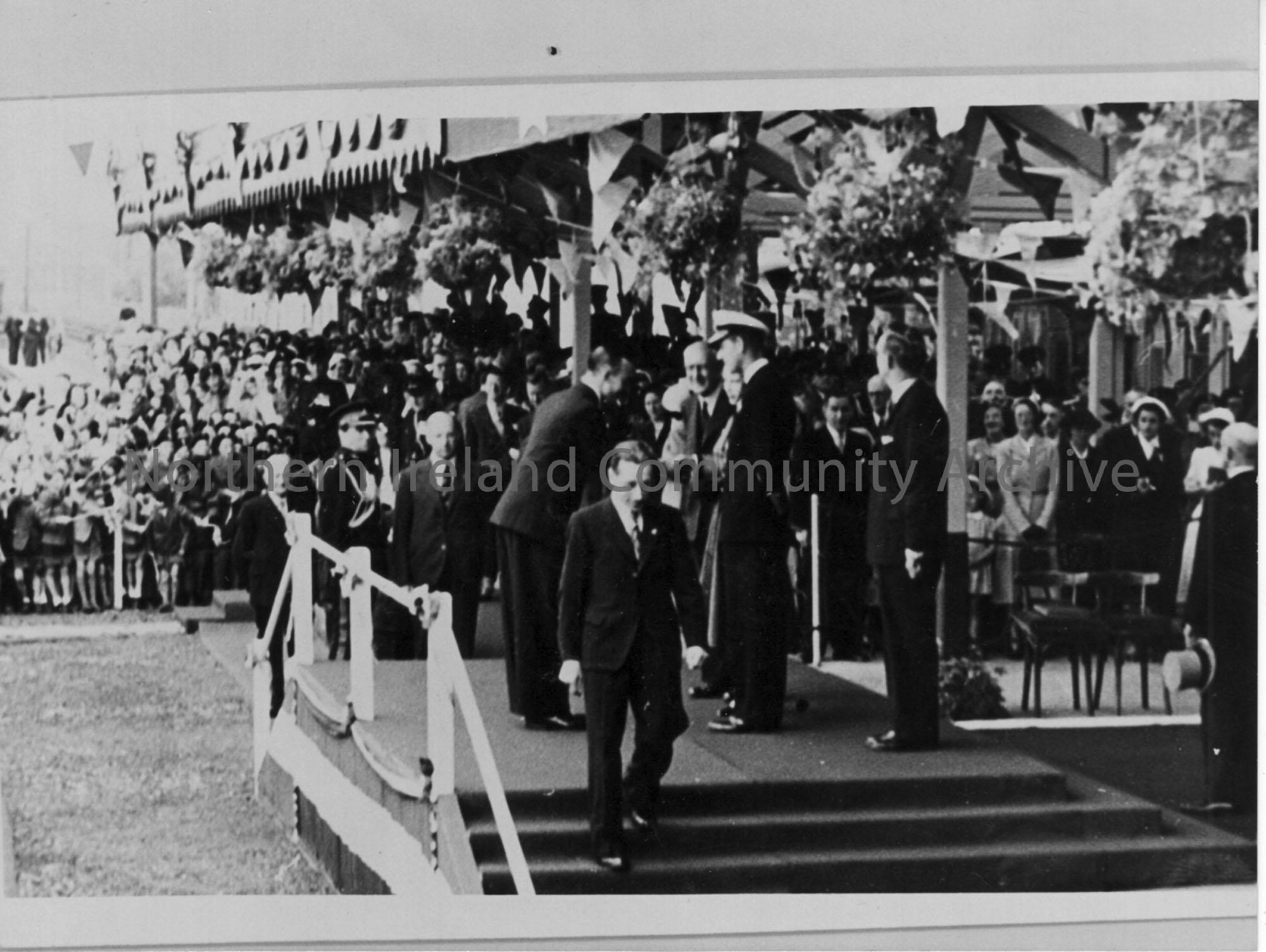 Black and White photograph of Bob Harrison being presented to the Queen during her visit in 1953