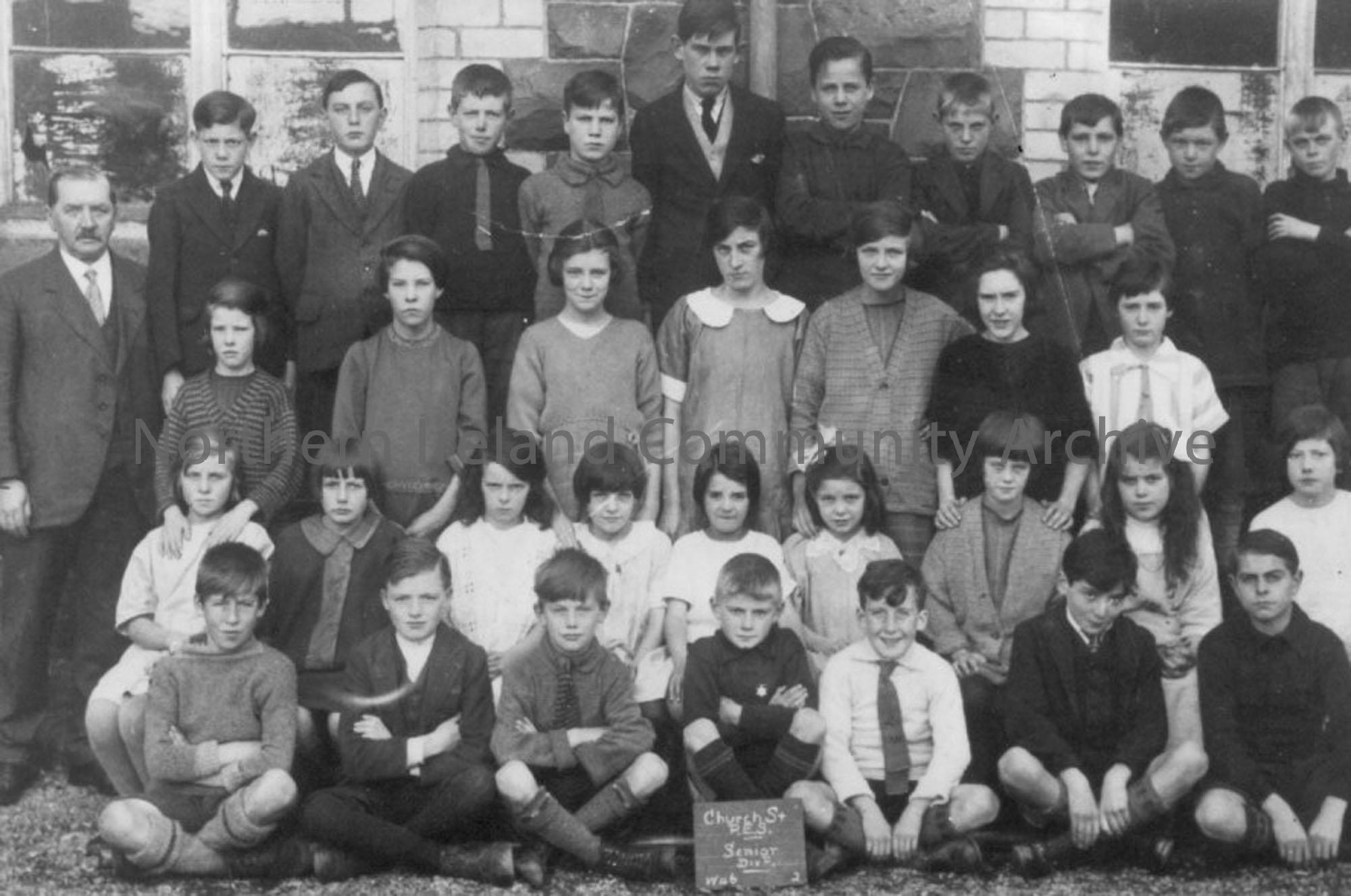 Black and white photograph of Church Street School Public Elementary beside St.Patricks Parish Church. (copies of originals) Picture is of a Senior class. C. 1927