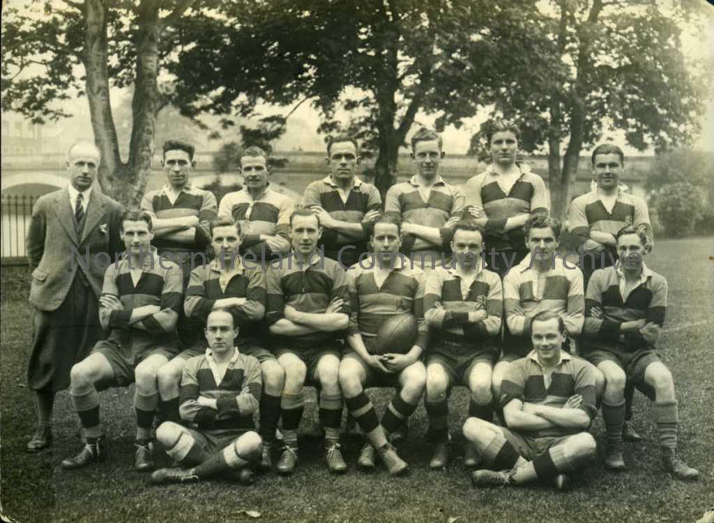 Black and white photograph of Coleraine Rugby Club taken outside the Boathouse. On the reverse reads – ‘Frank Hunter far left’