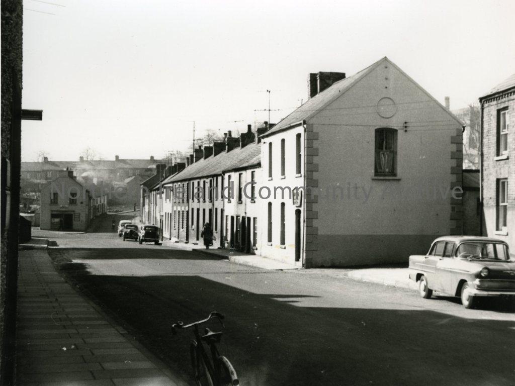 Black and white photograph of Elim Hall and adjoining houses, Killowen Street, Coleraine, 1957