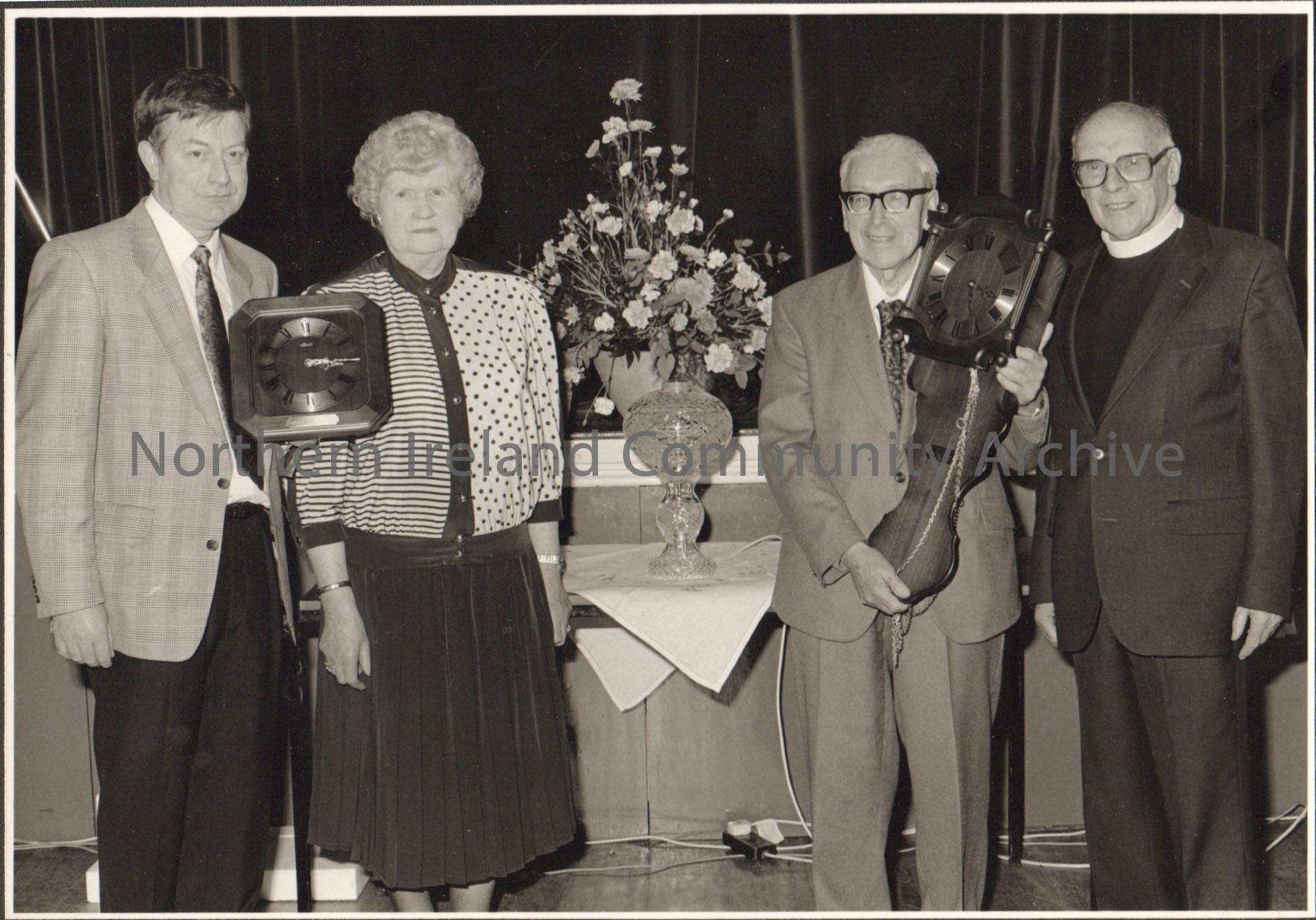 Black and white photograph of four people, including Molly Holmes and James McAfee. Two people are holding clocks. Taken in the Town hall auditorium