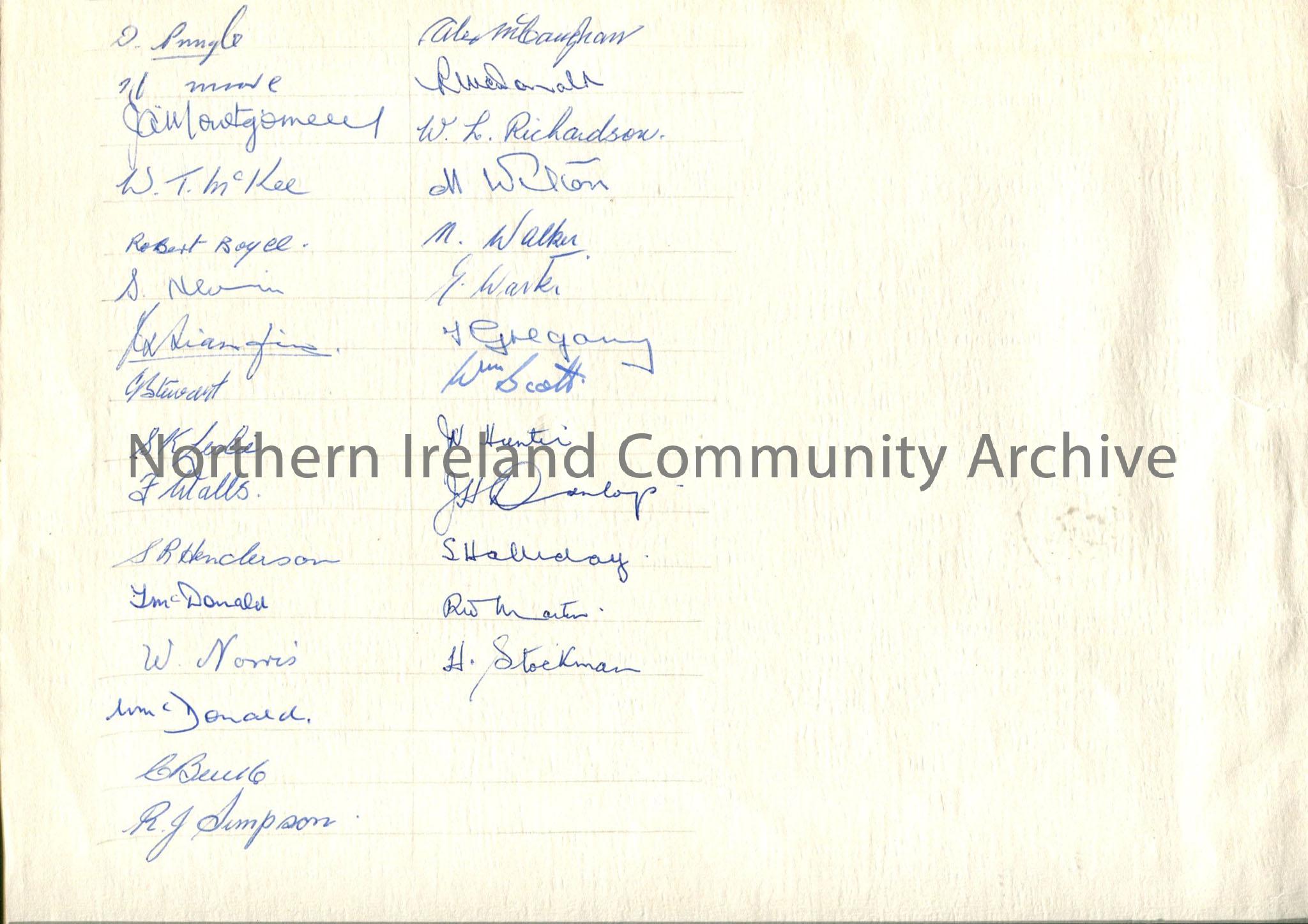 Black and white photograph of men in suits (Old Comrades Association - 6 Light AA Battery) contained inside a cream folder. Twenty nine of the men have signed the photograph.