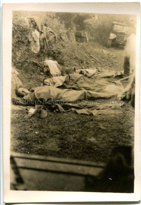 Black and white photograph of men lying under blankets in a ditch. Vehicle in the background.