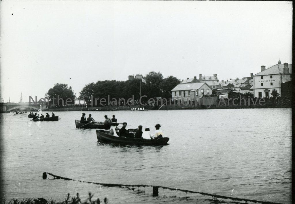 Black and White photograph of people in rowing boats on the River Bann, Coleraine. (Regatta Day, The Old Boathouse)