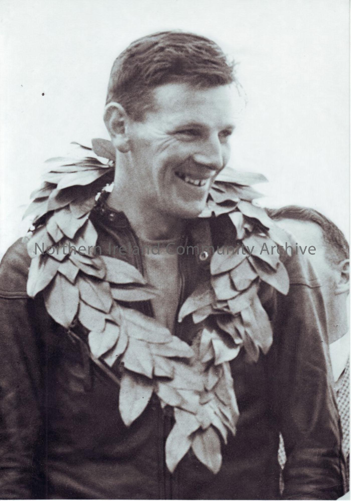 black and white photograph of Richard Creith with wreath around his neck