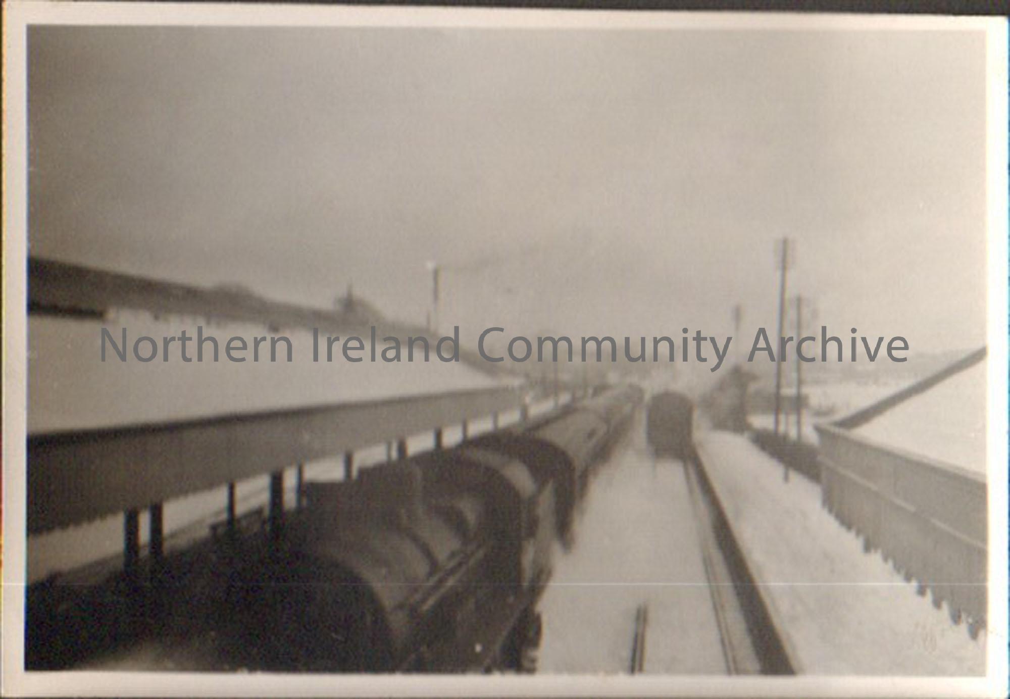 Black and white photograph of steam train in Ballymoney Station in the snow.