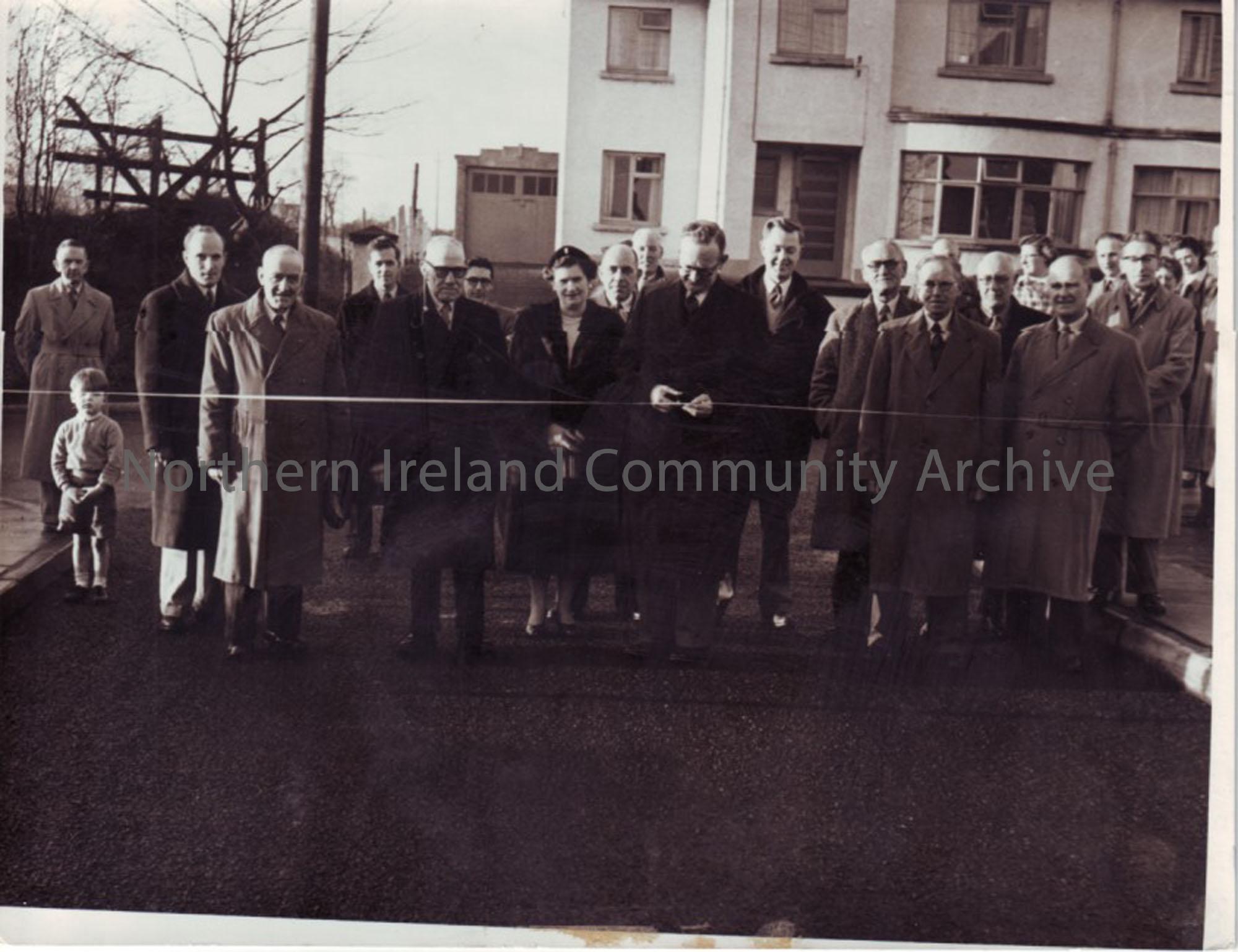 black and white photograph of the cutting of the ribbon at an opening ceremony, Newal Road houses?