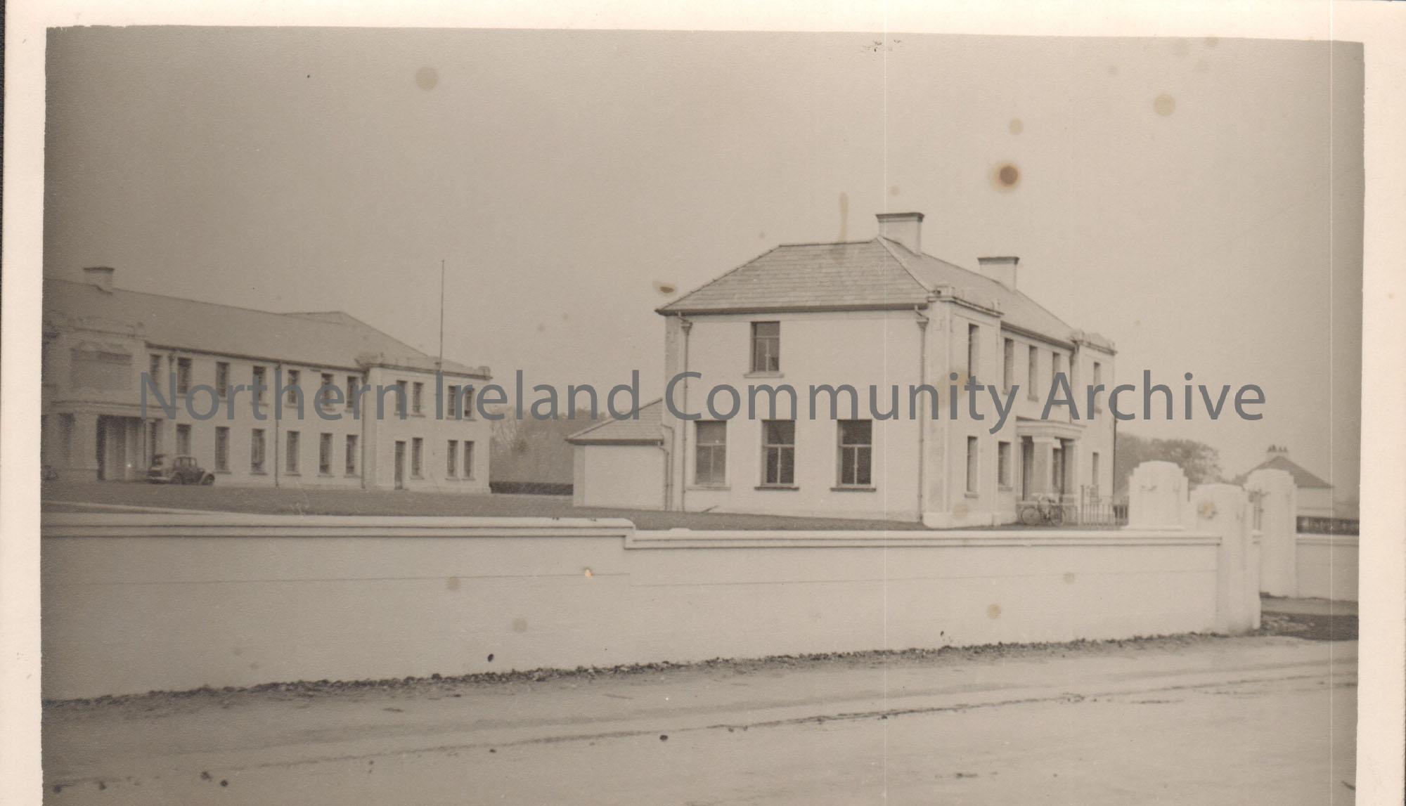 Black and white photograph of the Route hospital from the road