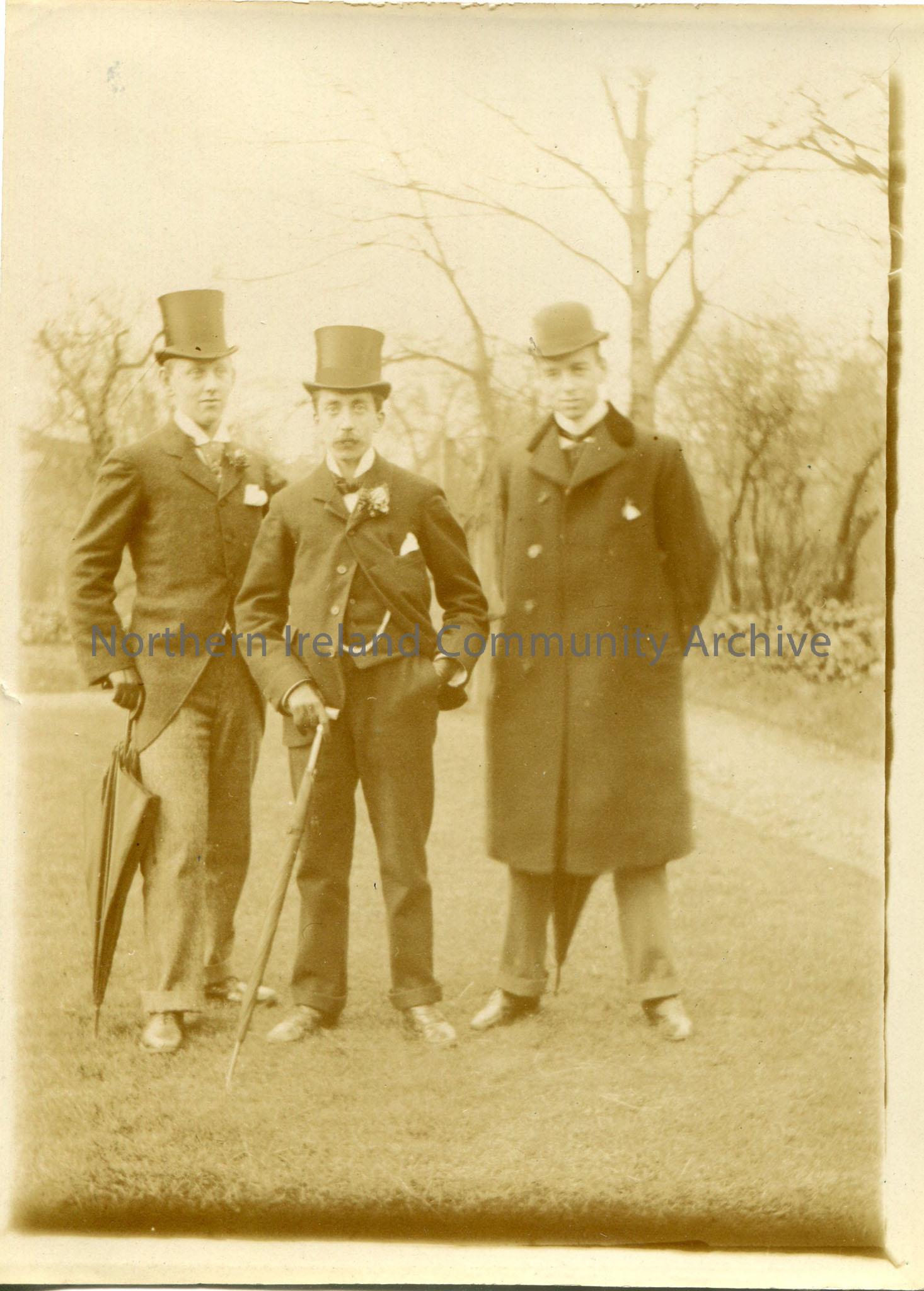 Black and white photograph of three men standing with umbrellas. Two are wearing top hats and the other a bowler hat.