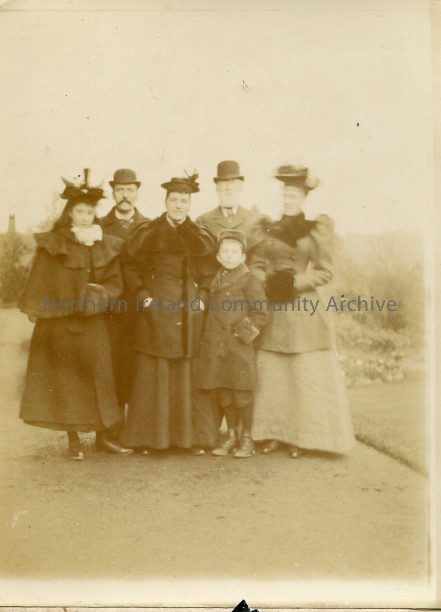 Black and white photograph of two men, two women, one younger woman and a boy.