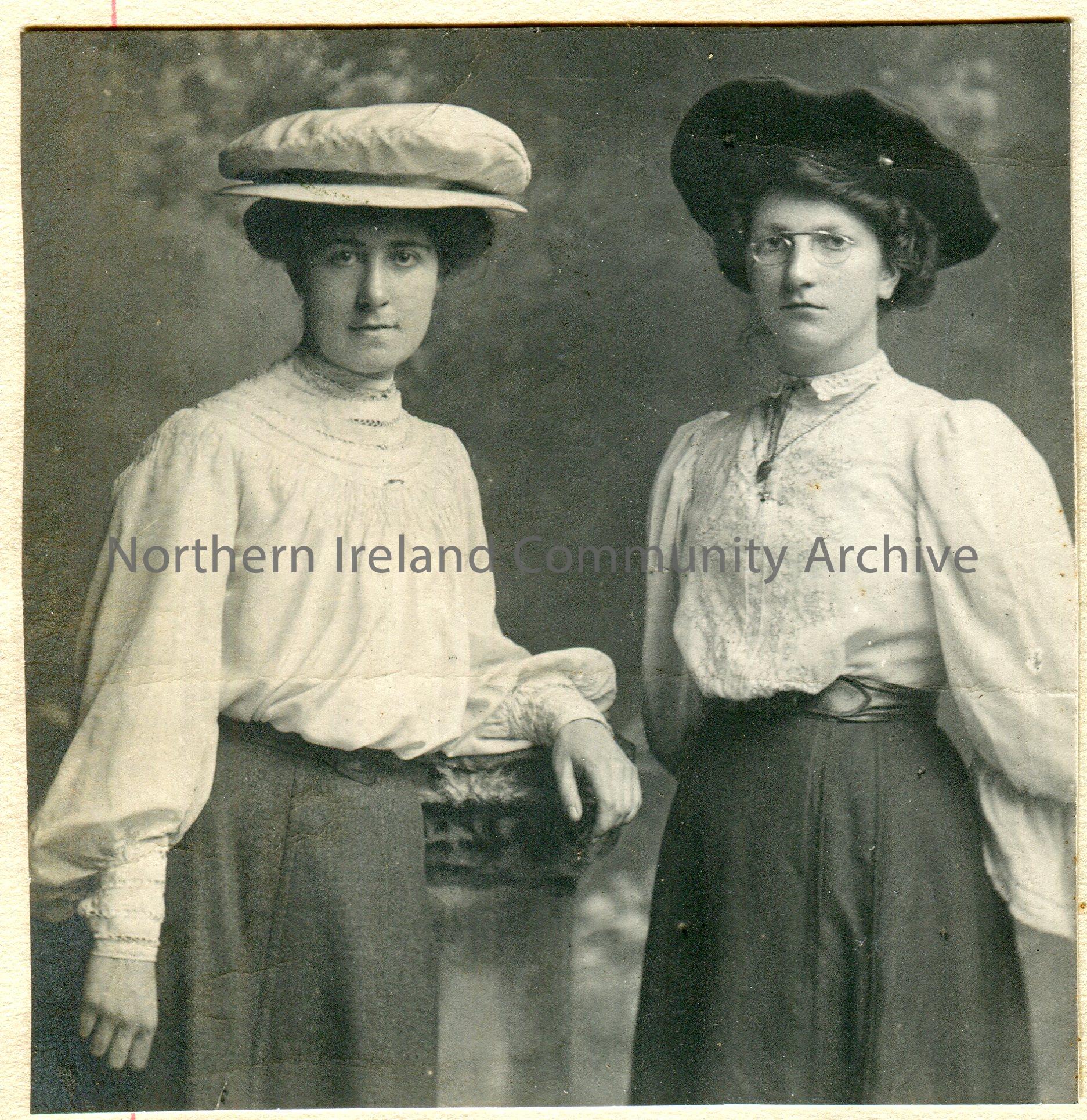 Black and white photograph of two young women wearing Victorian style dress. They are both wearing hats and the woman on the right is wearing glasses.