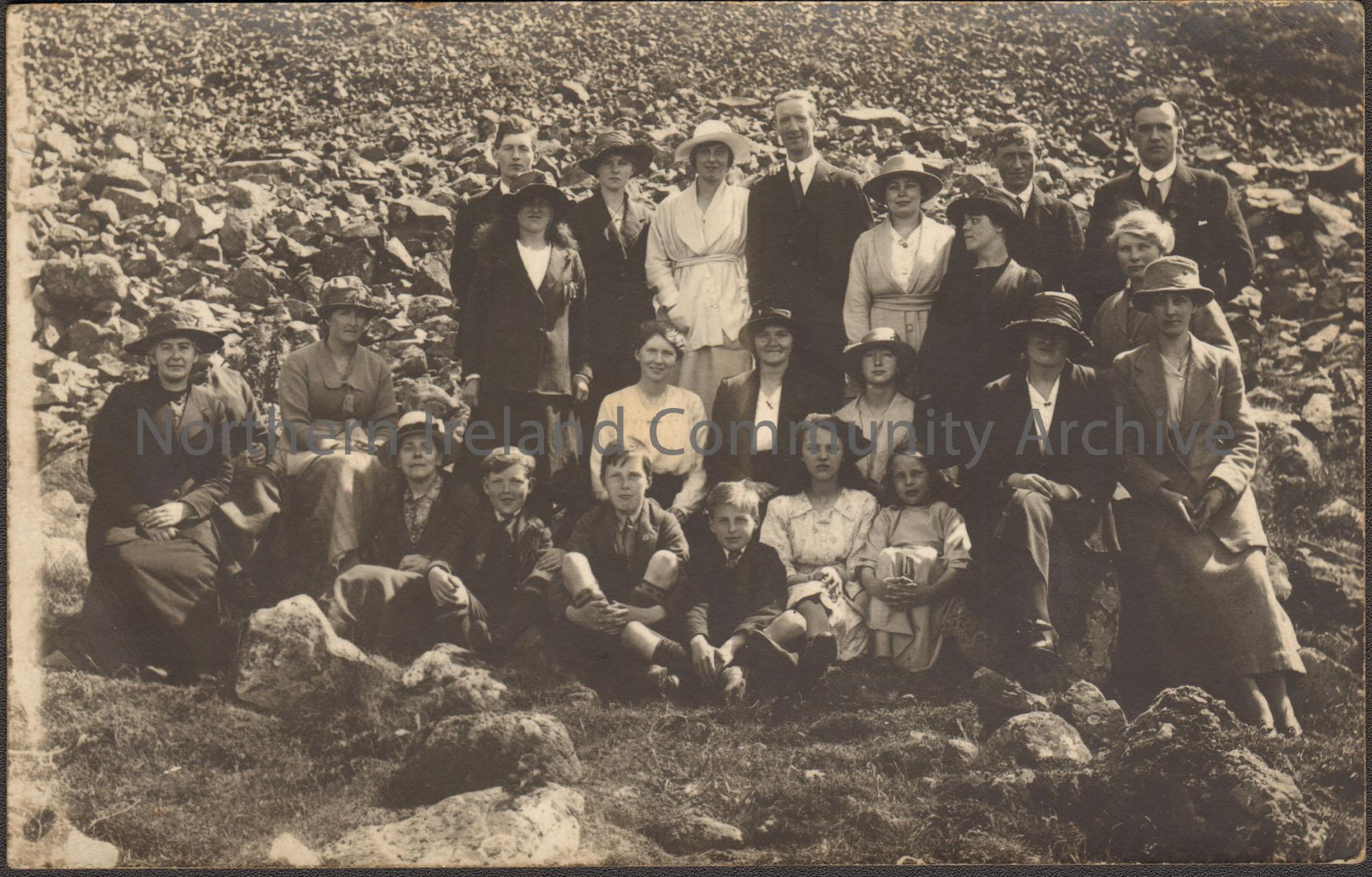 Black and white photograph of well dressed people in front of a rocky hill. Group are Trinity Church Choir.