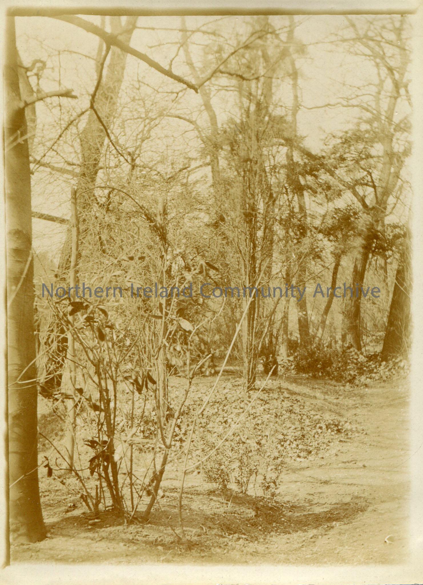 Black and white photograph of woodland.