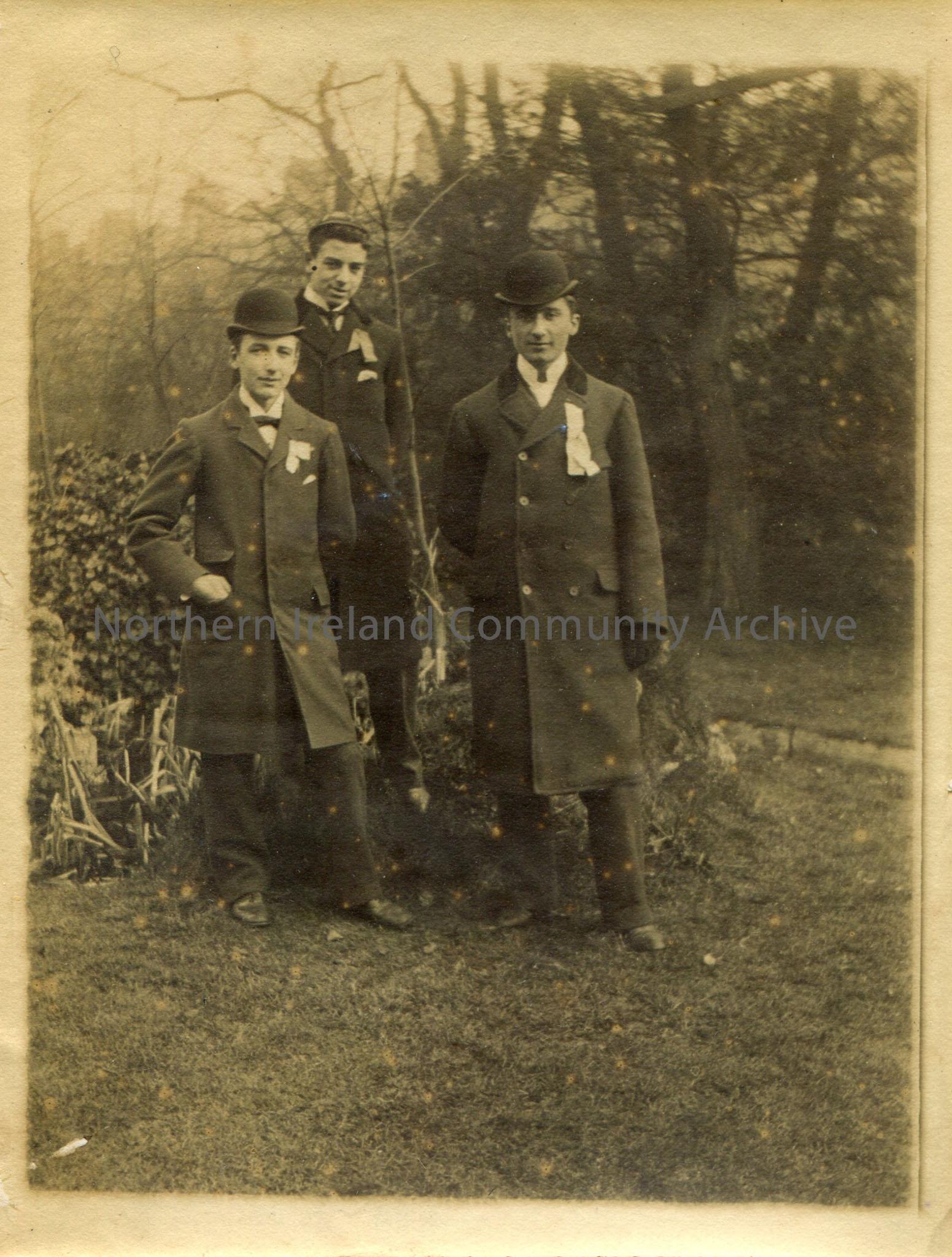 Black and white photograph or copy of three young men. Arbil, Hillington, Dekens.