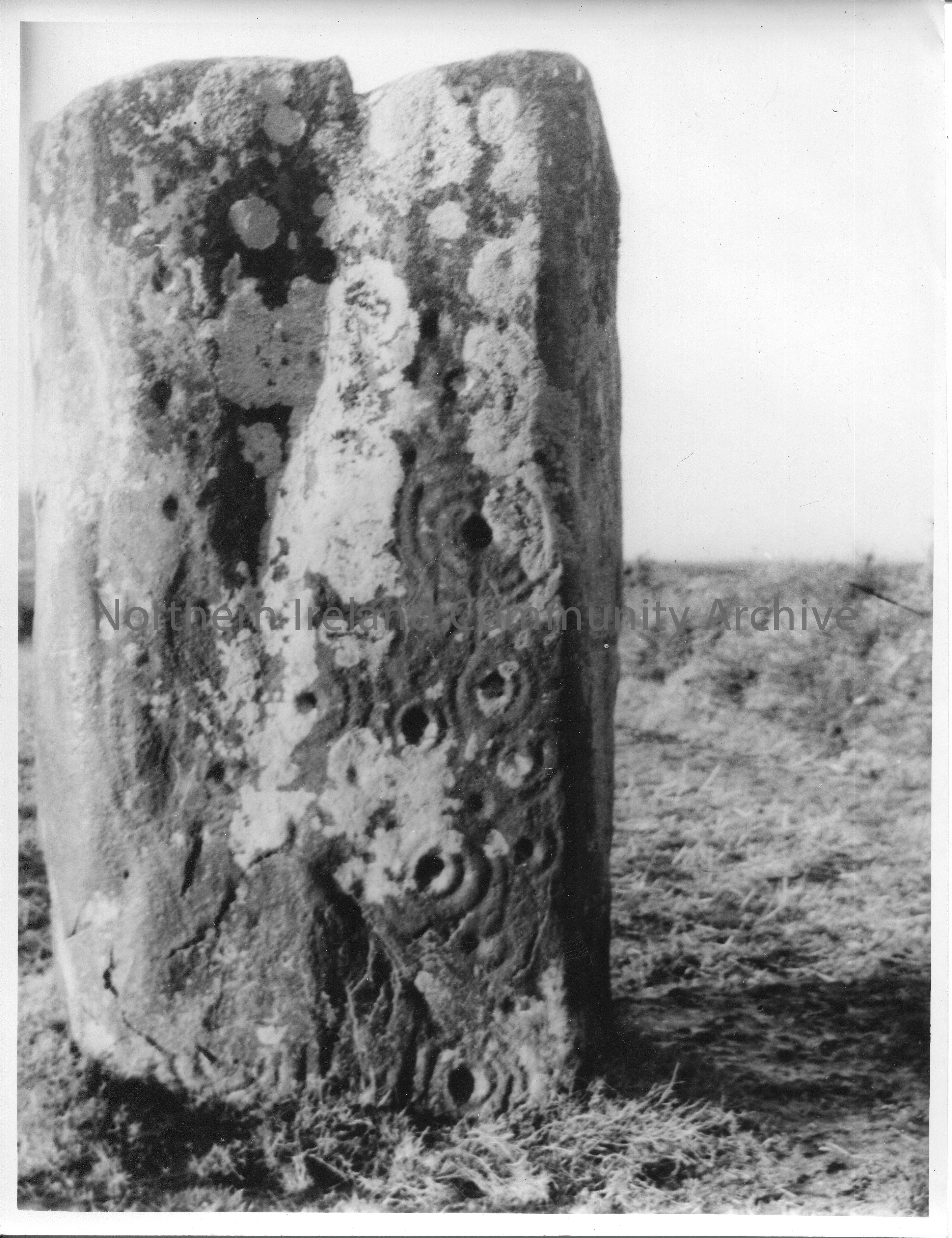 Black and white photograph surrounded by white border of a large stone featuring holes and spiral markings.